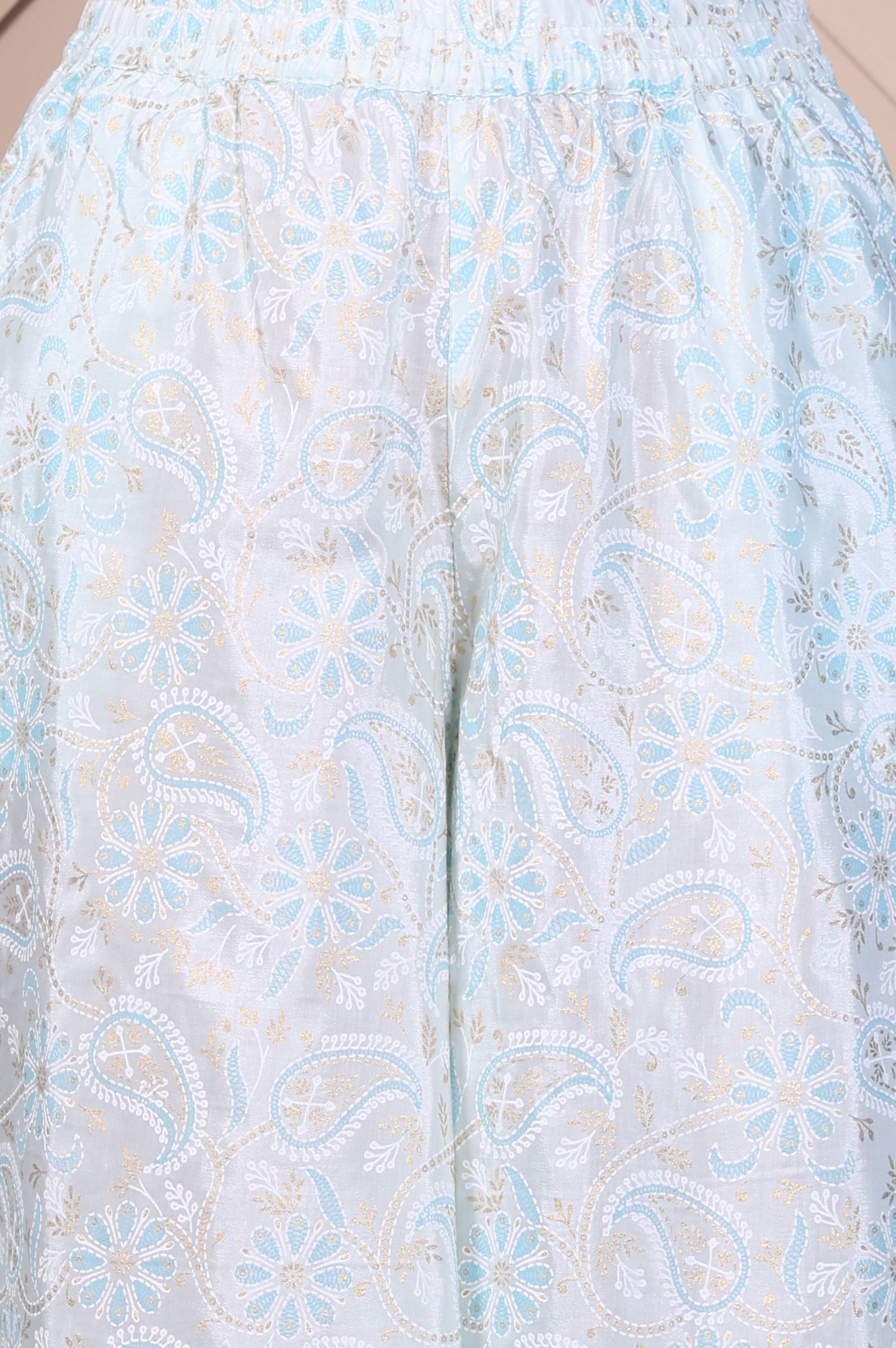 This elegant 3-piece set features a short kurta in textured fabric, designed in a serene sky-blue hue with intricate heavy yoke embroidery and a round neckline. The 3/4th sleeves are enhanced with an embroidered border, adding a refined touch. Paired with a tonal chikankari-printed semi-flared palazzo with convenient pockets on both sides, this ensemble combines comfort and sophistication. Completing the look is a chiffon drape with an all-over chikankari print in white, accented with blue details, making it perfect for festive and special occasions.