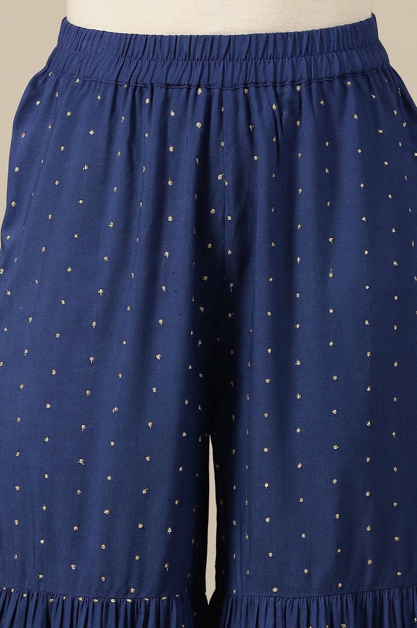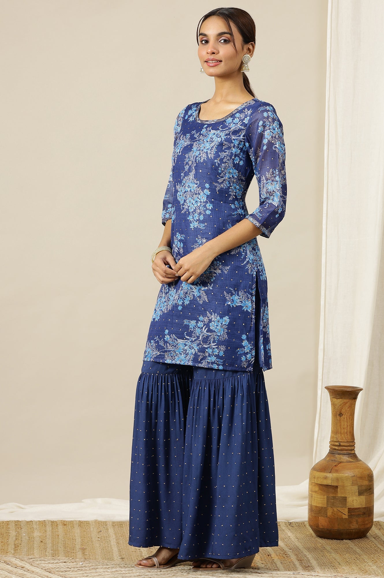 Blue Floral Printed Zari Embroidered Short Kurti, Tiered Sharara and Dupatta Set