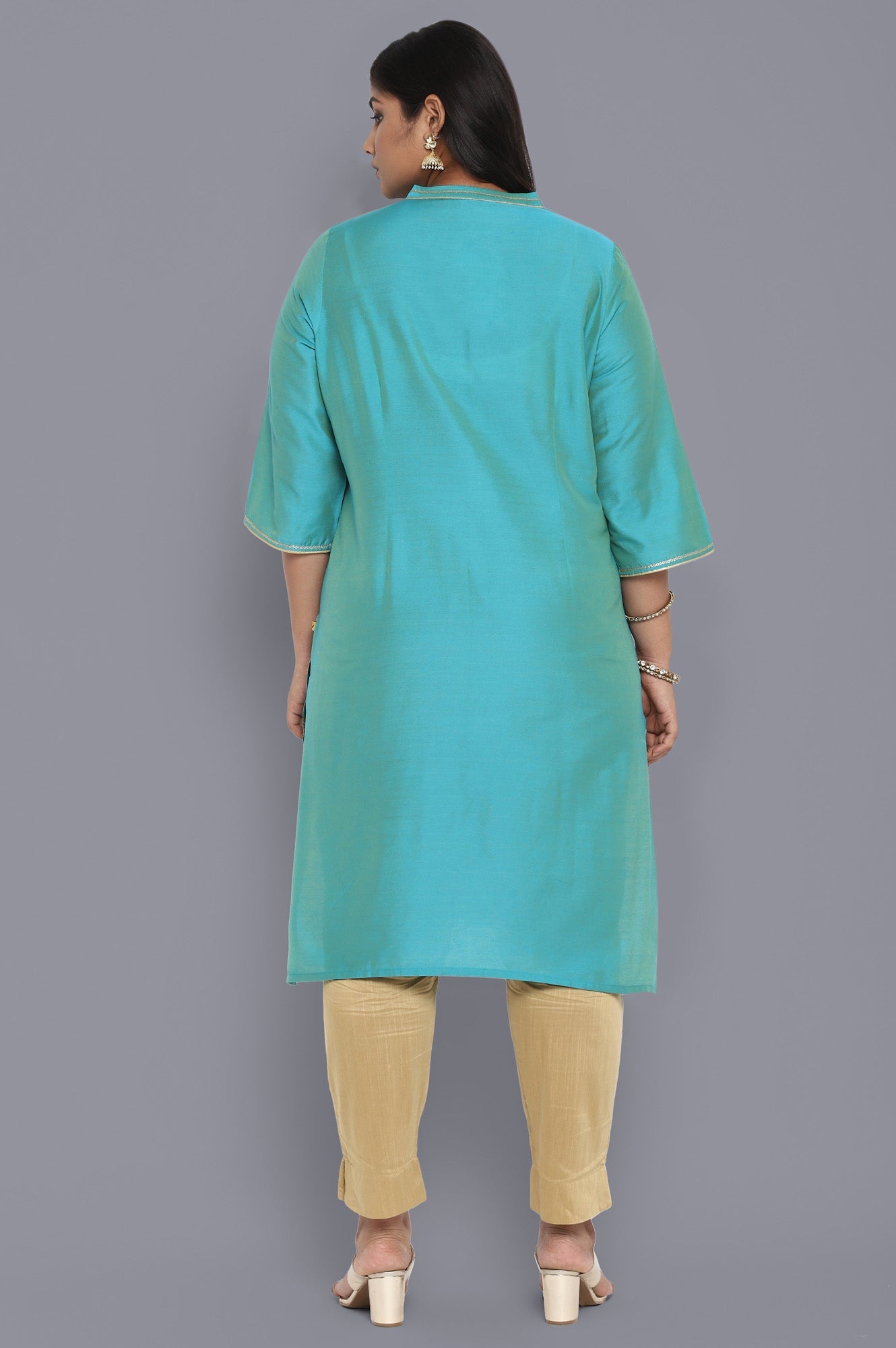 Peacock blue foil print kurta in mandarin neck and three fourth sleeves. It features concealed button placket and side slits.