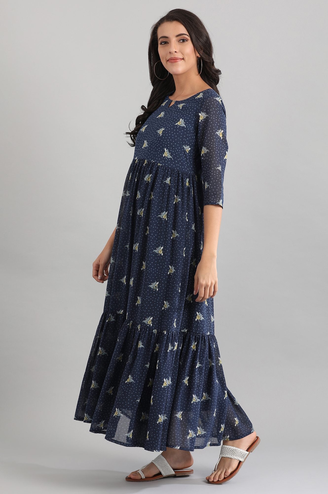 Blue gathered dress in round neck with V and 3/4th sleeves.