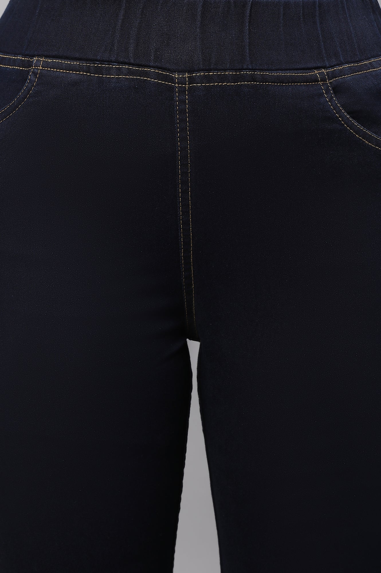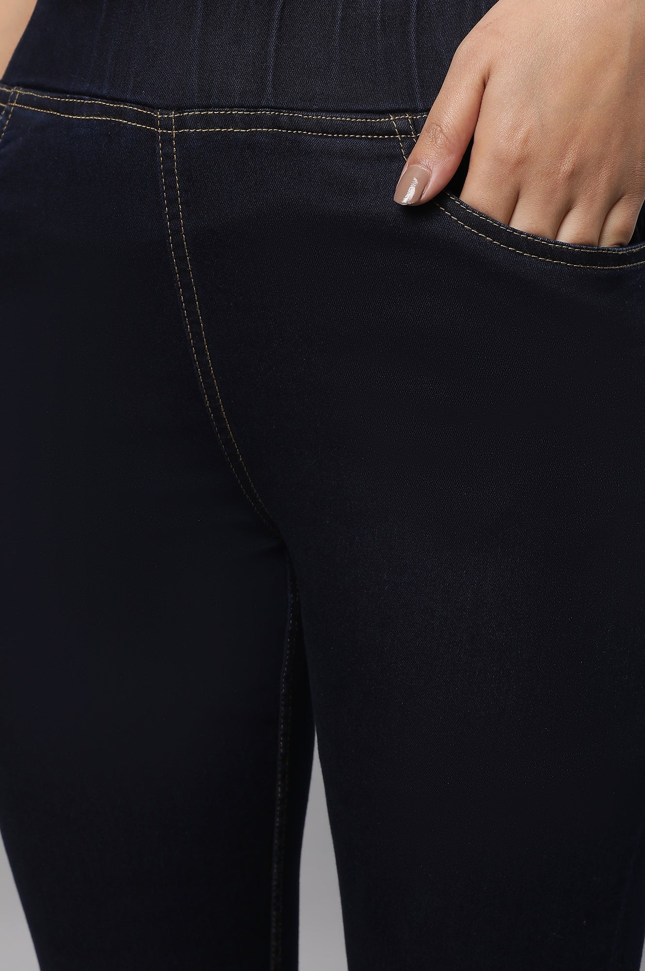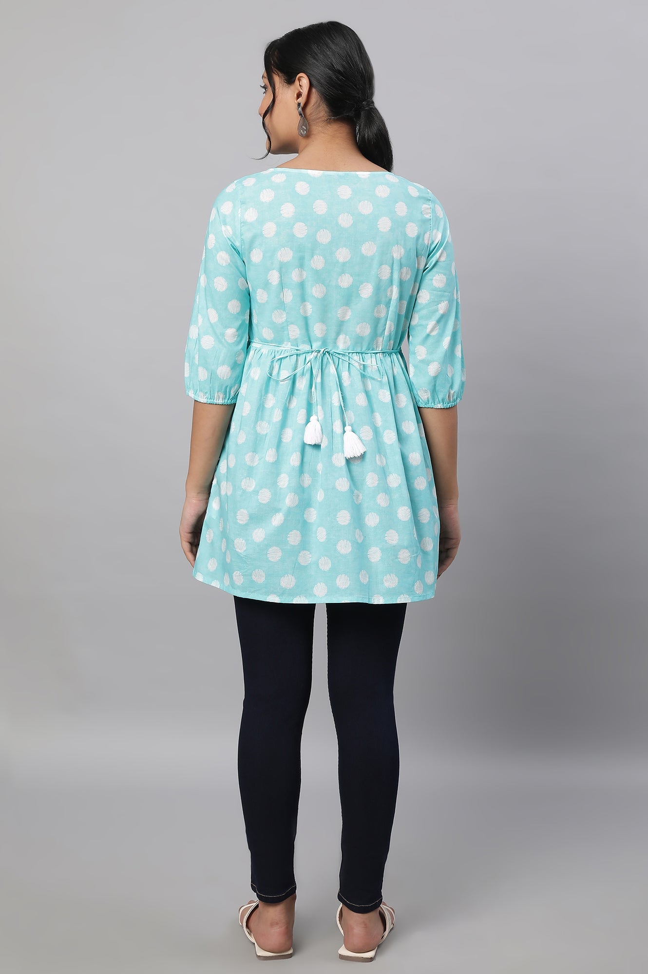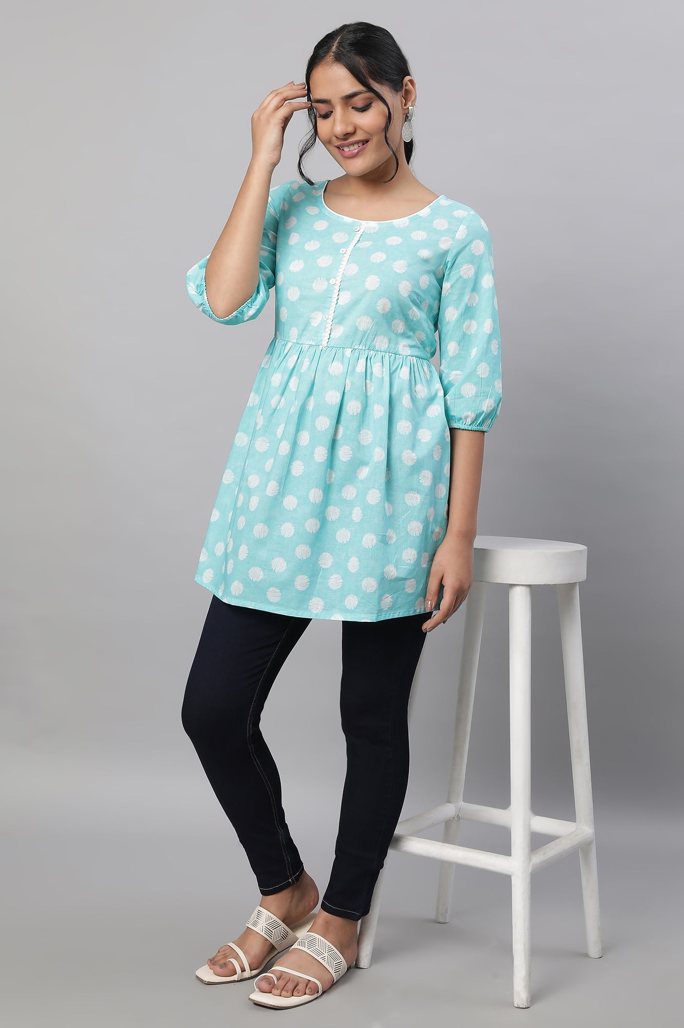 Get a smart travel look in this stylish and comfy kurta set. The set has short kurta in polka print and it is paired with blue denim jeggings.