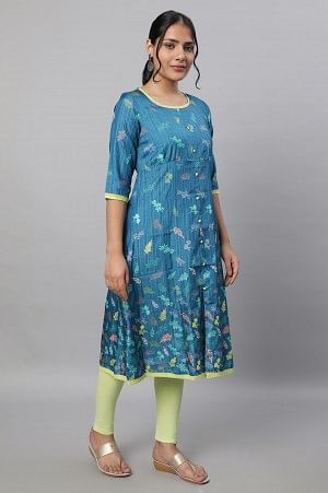This A-line silhouette kurta set is a playful delight of our collection. This set includes beautiful floral printed kurta having contrasting lace and buttons. This chic top-wear comes with contrasting lemon yellow tights.