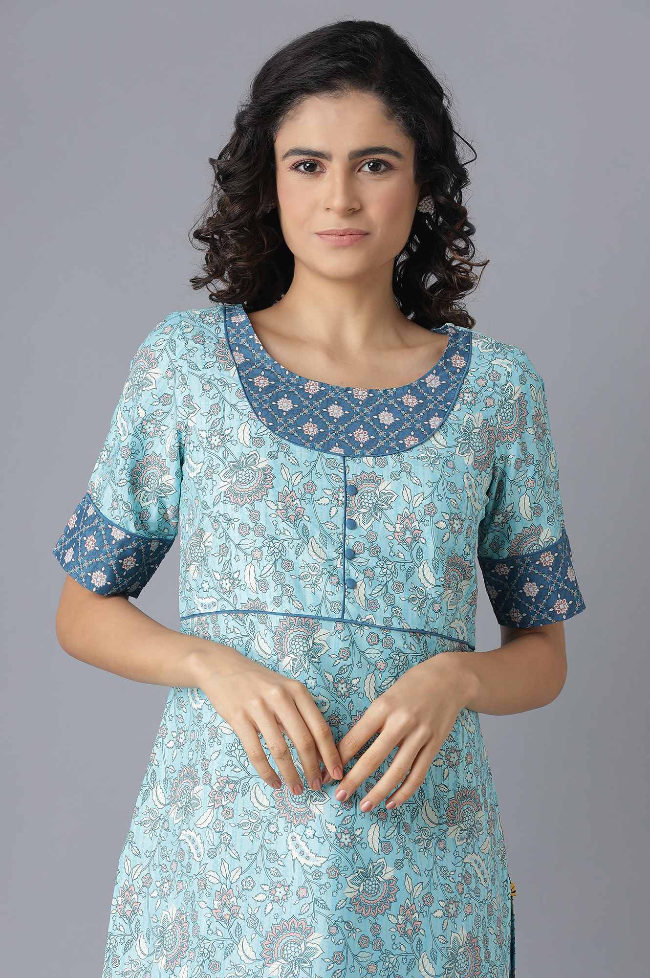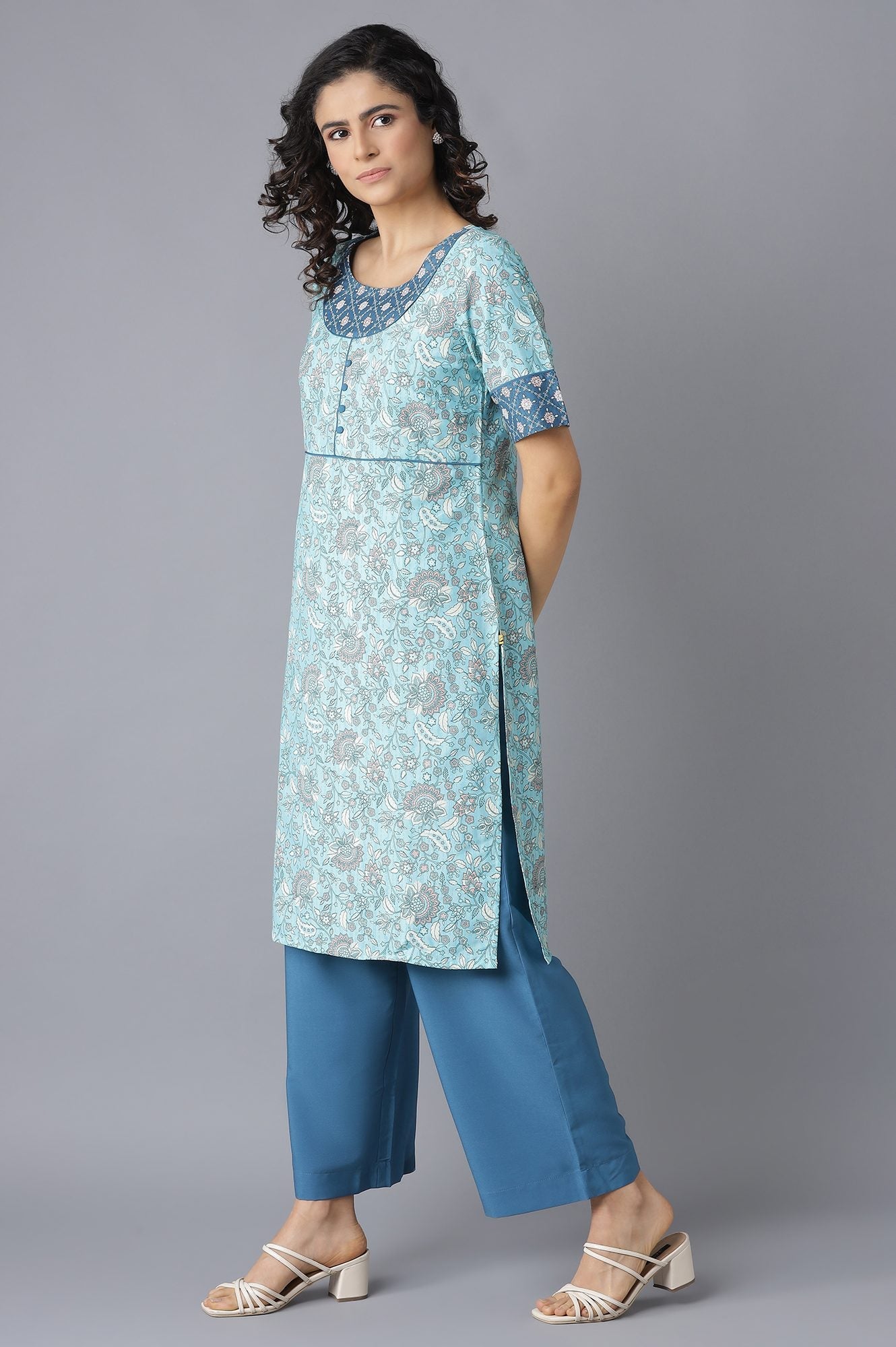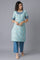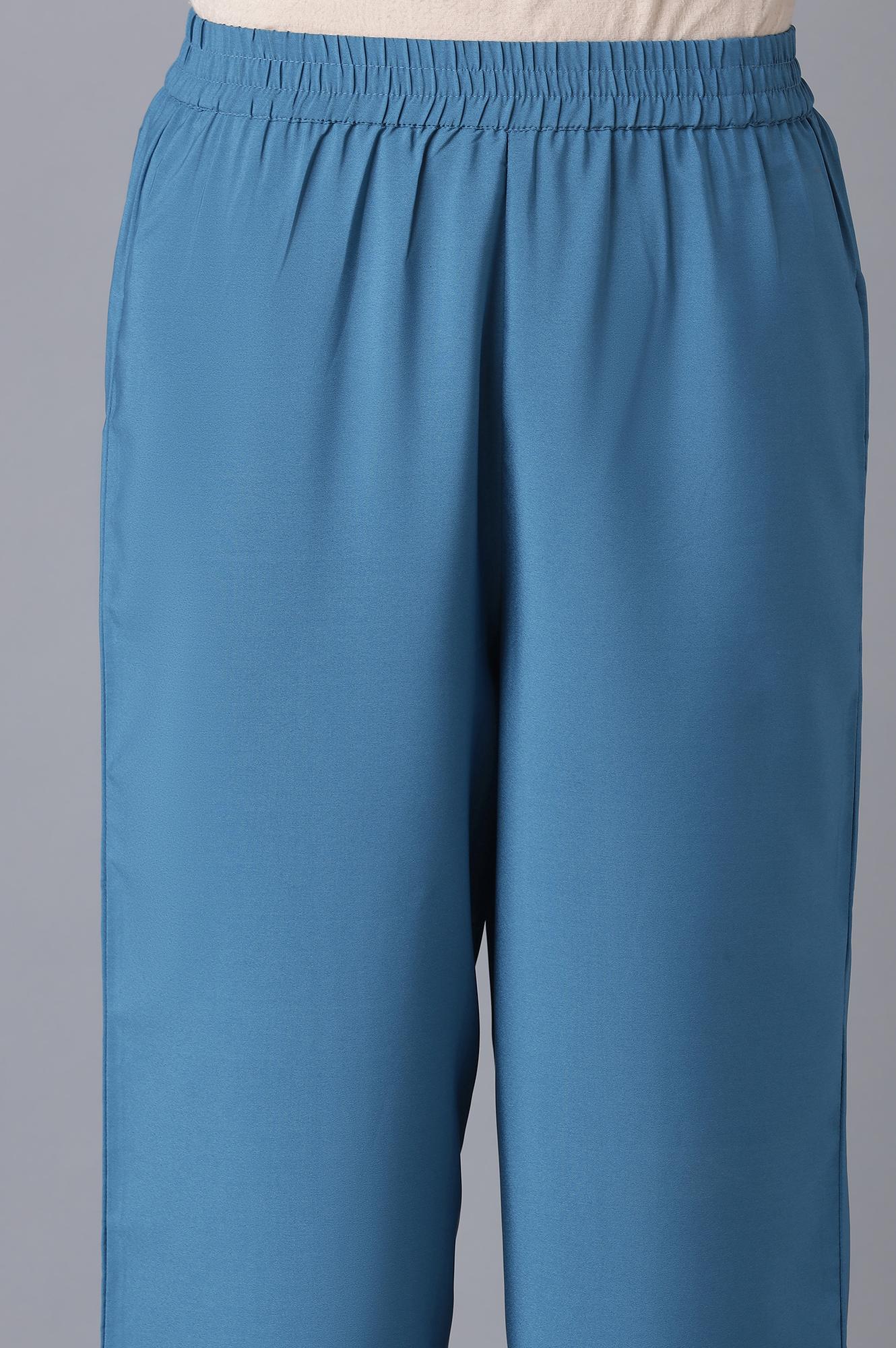 Rich in style and elegance, this ethnic set will turn heads where ever you go. The set includes blue straight fit kurta having elbow sleeves and floral motifs. And, it is paired with flared culottes tailored in high-rise and has elasticated waistband.