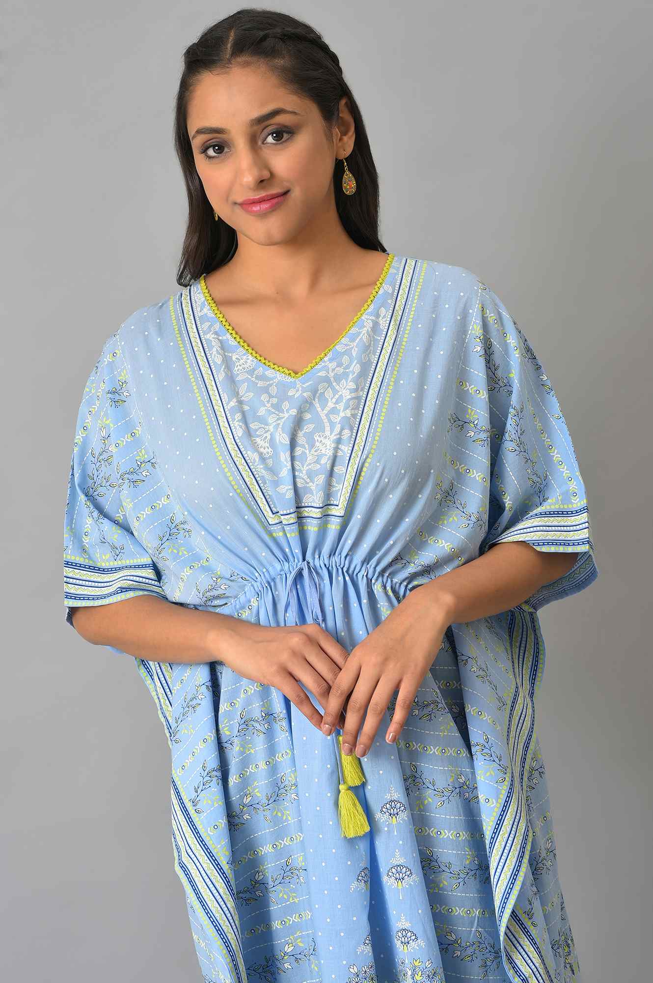 Get Admired As You Walk By Looking Absolutely Gorgeous In This Free Size Placement Printed Kaftaan. The Natural Fabric Will Keep You Super Cool Even At The Hottest Hour Of The Day. This Beautiful Kaftaan Features A V-Neckline Adorned With Contrasting Lace. The Tasselled Drawcord At The Waist Can Be Adjusted As Per Any Size.
