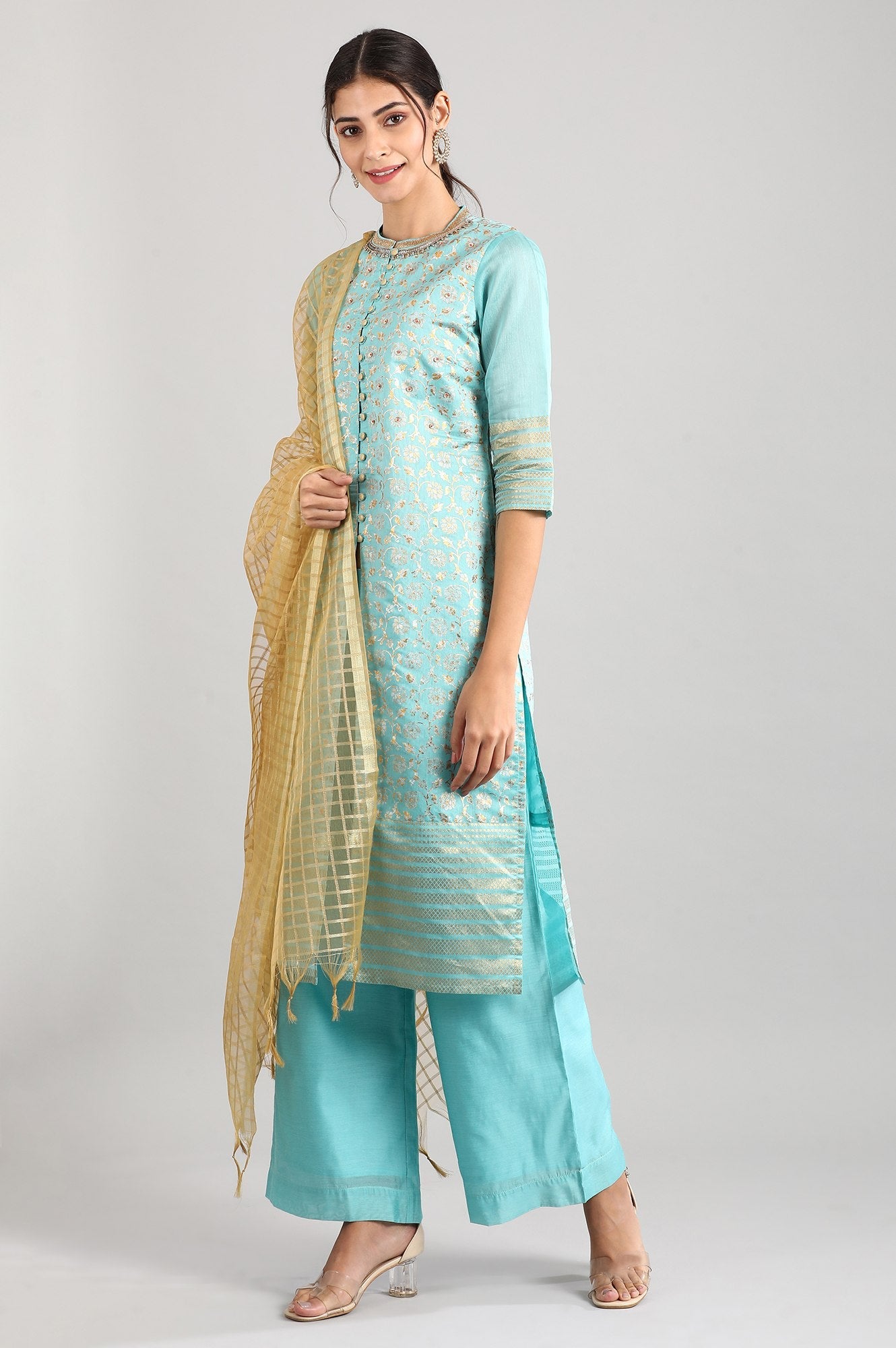 This set has a round neck blue printed kurta with placket detail and embellished neckline, solid yarn-dyed trousers and yarn-dyed golden dupatta.