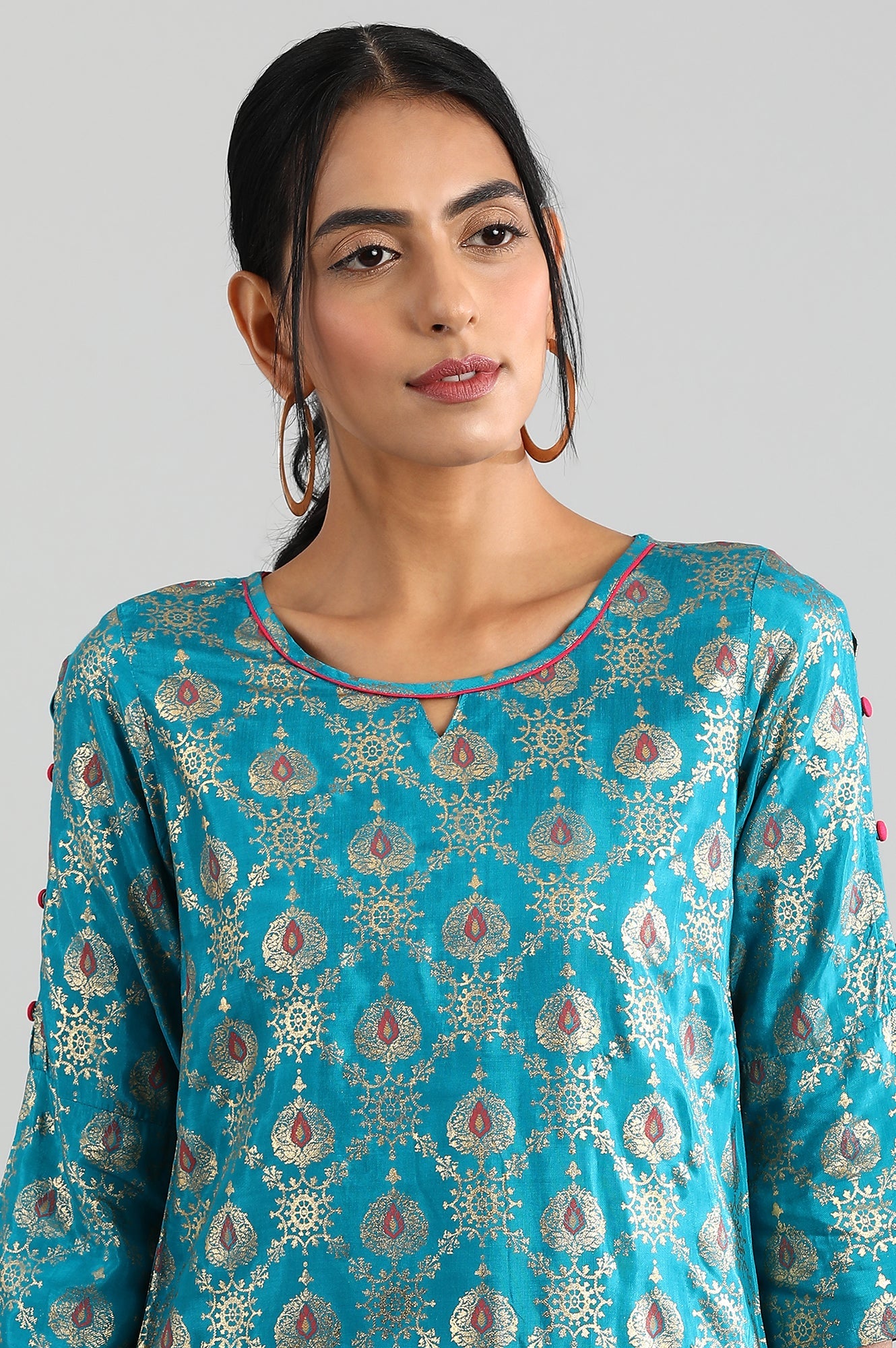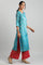 Blue round neck straight kurta with printed detail.