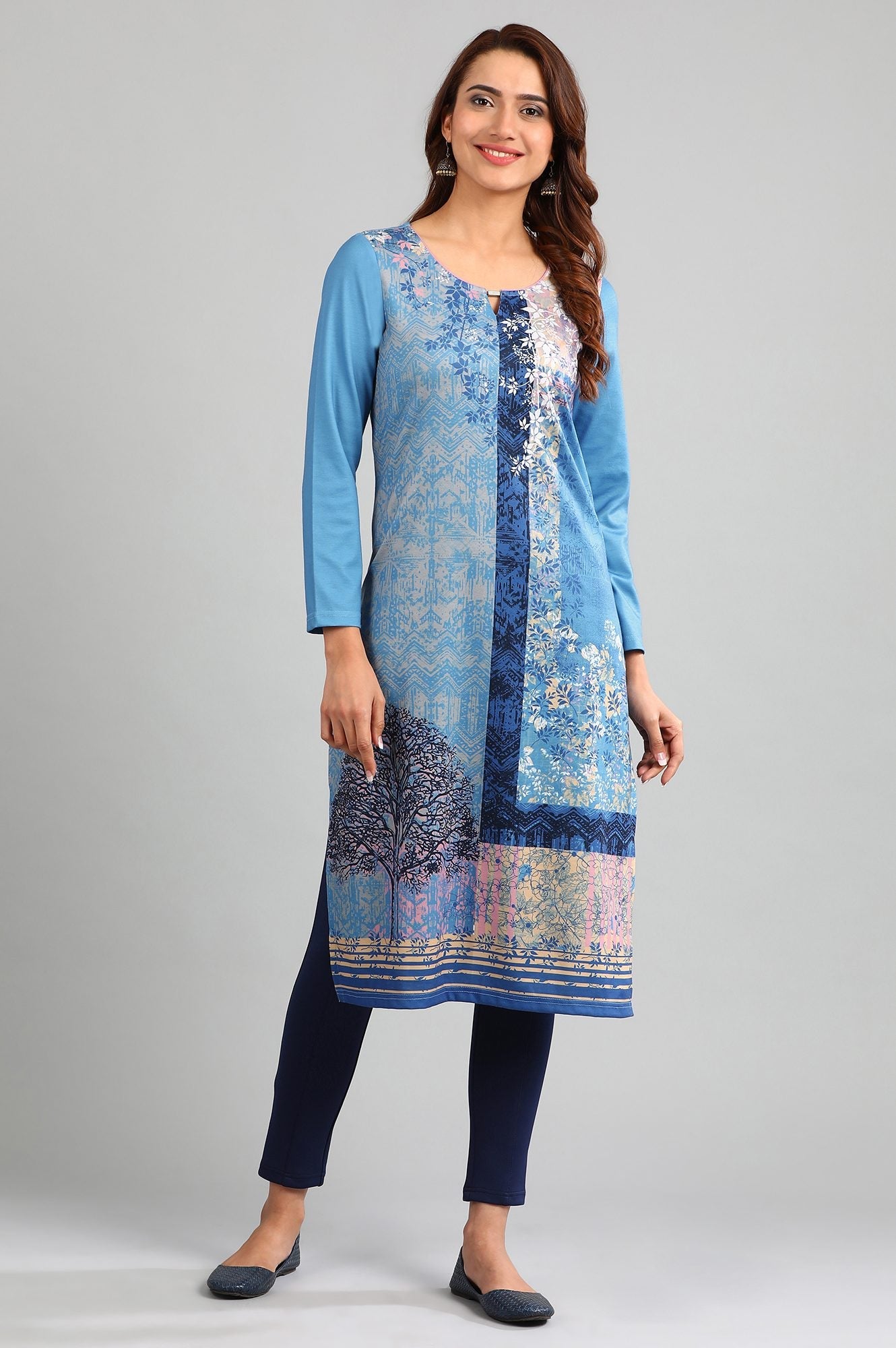 Blue round neck yarn-dyed winter kurta with piping and keyhole detail.