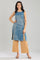 This blue round neck yarn-dyed kurta with golden lace at neckline and tie-up on one side.