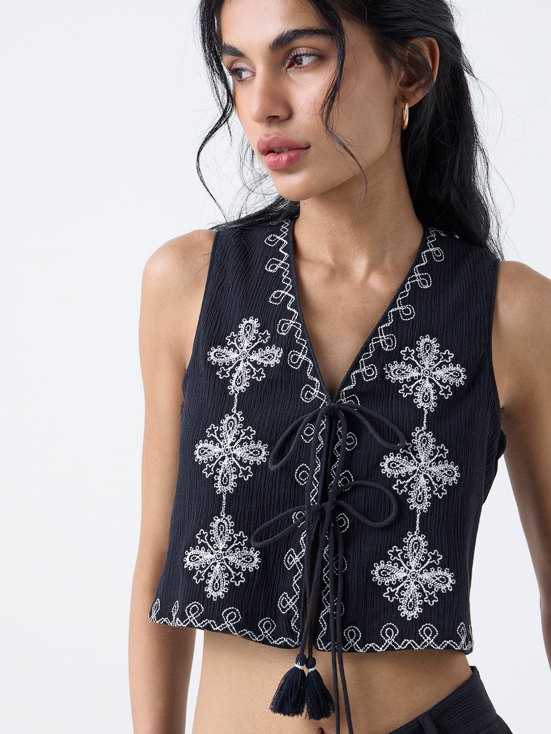 Modern boho meets handcrafted elegance in this black vest top from Bombay Paisley. Styled in a crinkle-textured fabric, it features delicate floral embroidery that elevates the deep V-neckline. The front tie-up finished with playful tassels brings a festive, free-spirited mood.