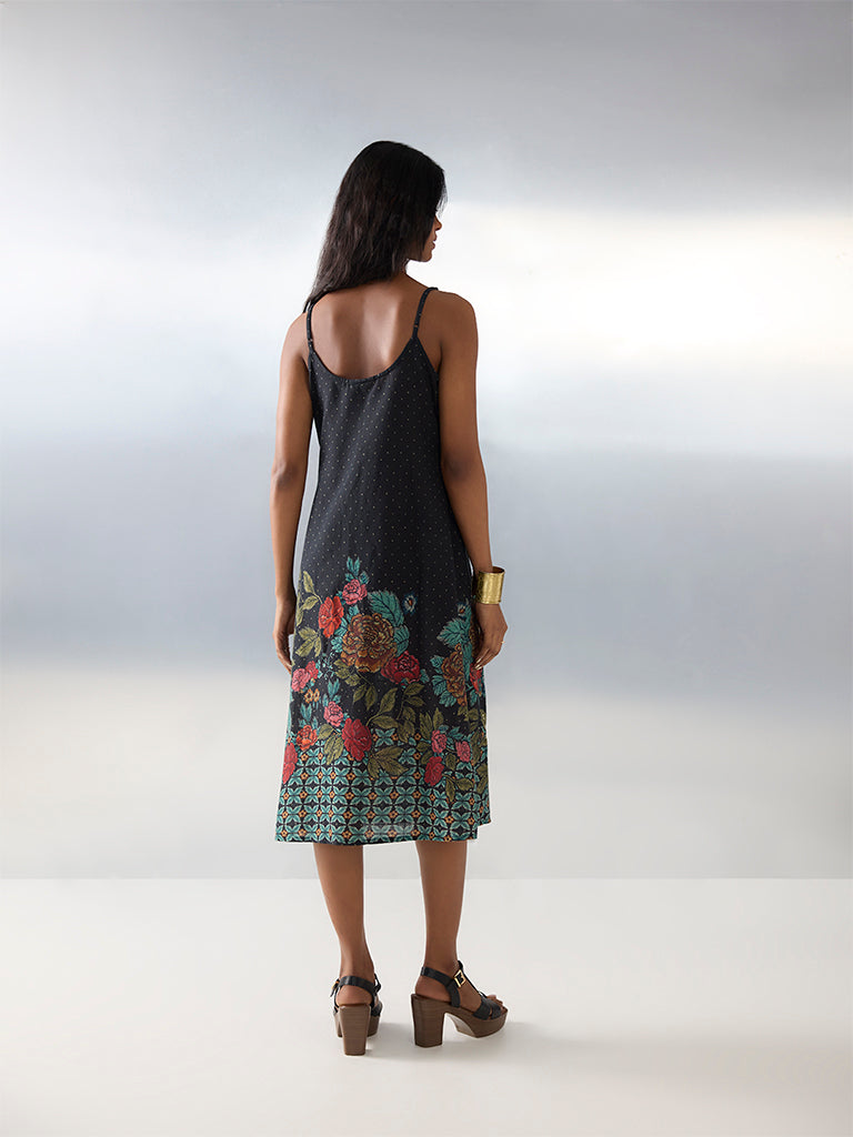 This black dress by Bombay Paisley boasts vivid floral patterns throughout an A-line silhouette. Crafted from cotton-rich fabric, it is framed with a scoop-neck and adjustable straps, offering superior comfort. An easy summer essential that pairs style with everyday ease.