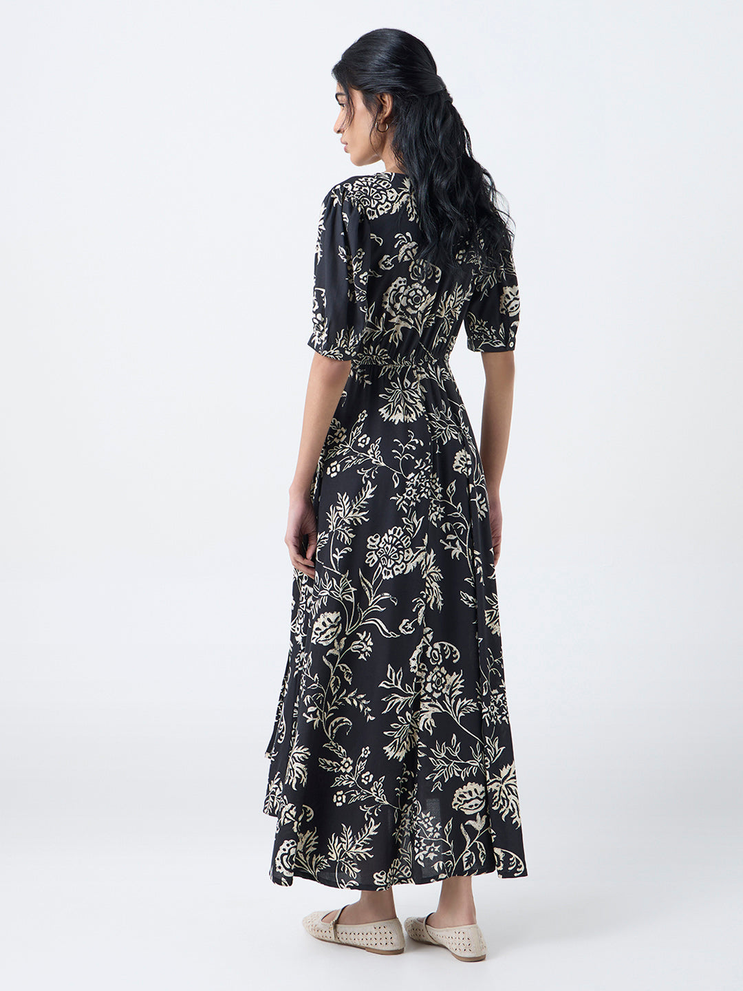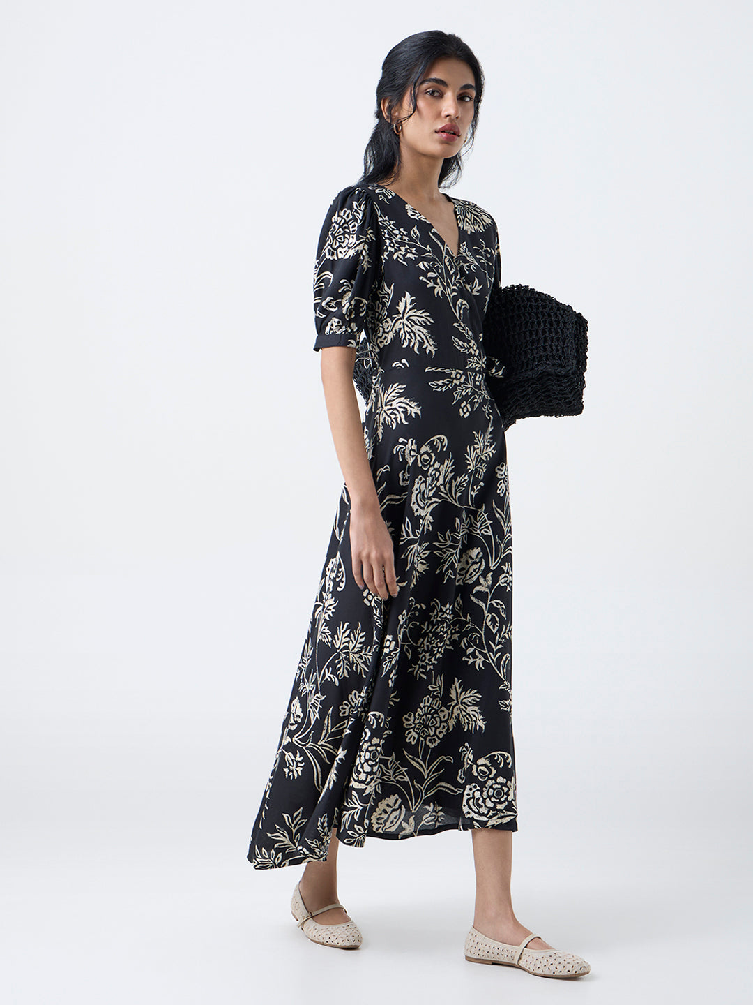 Bombay Paisley Black Foliage Pattern Wrap-Style Dress