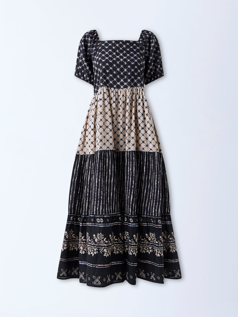 This black tiered dress from Bombay Paisley is an easy pick for your holiday edit. The square neckline and puff sleeves add a romantic frame, while the smocked back ensures comfort through the day. Mixed-print tiers bring in that signature boho playfulness. Made from pure cotton, it slips comfortably into your daytime outings, casual dinners or holiday wardrobe.