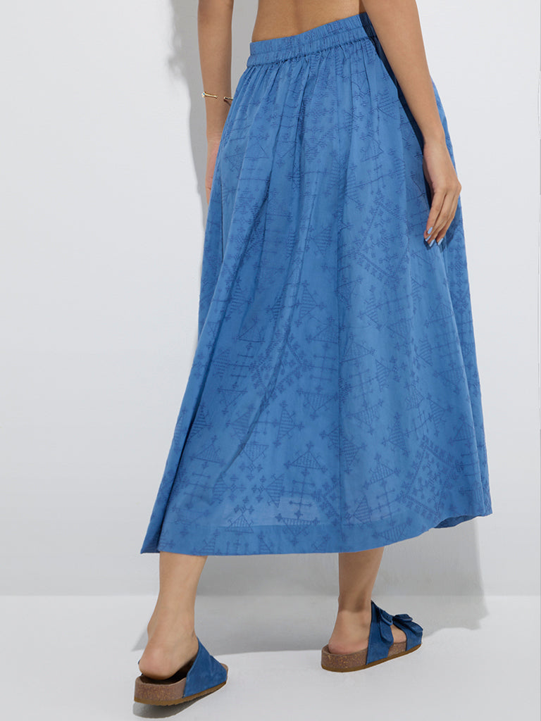 This blue midi skirt from Bombay Paisley showcases intricate tribal-inspired embroidery that adds a touch of artisanal charm. Milled from pure cotton for ultimate comfort, it features an elasticated waistband that ensures a secure fit. Thoughtfully finished with functional side pockets, this piece blends everyday ease with distinctive style.