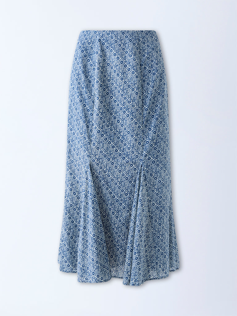 This blue fishtail skirt from Bombay Paisley channels effortless ease with a sculpted silhouette. The fluid drape is adorned with dainty floral motifs, while a concealed zip closure at the back keeps the finish refined. A modern nod to traditional print work, it’s designed to sit seamlessly between weekday polish and weekend whimsy.