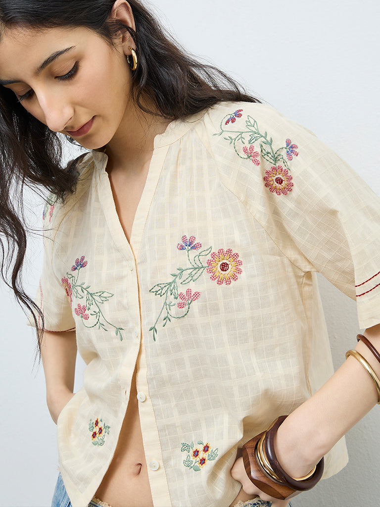 Bombay Paisley Cream Floral Embroidered Cotton Top