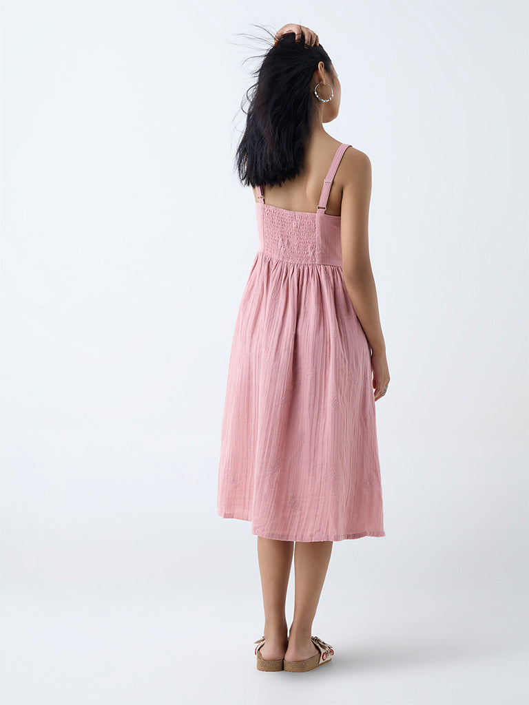 This dusty pink dress from Bombay Paisley is constructed from pure cotton with a self-textured finish. Shaped in a breezy A-line silhouette, it features a V-neck, adjustable shoulder straps, and a smocked back that ensures all-day comfort. A pocket at the side adds an element of functionality, while the dainty butterfly embroidery enhances its look.