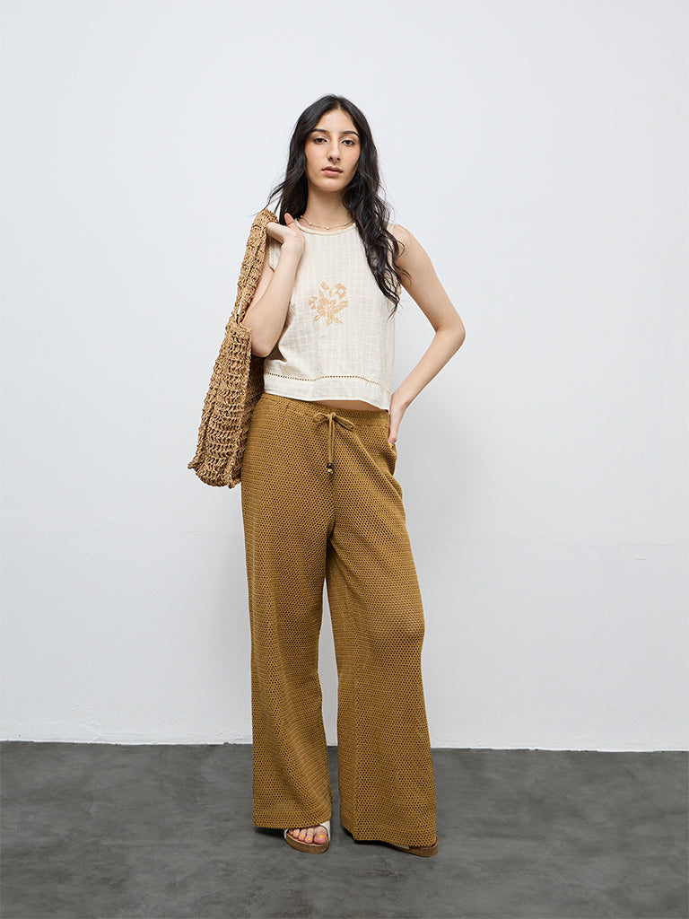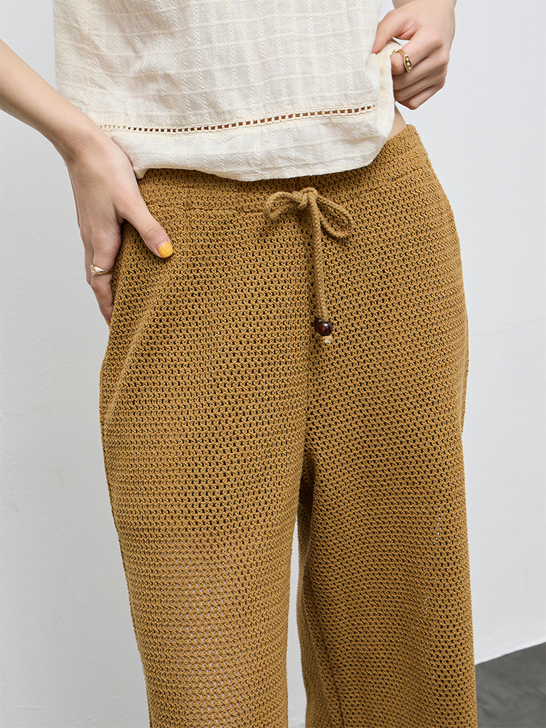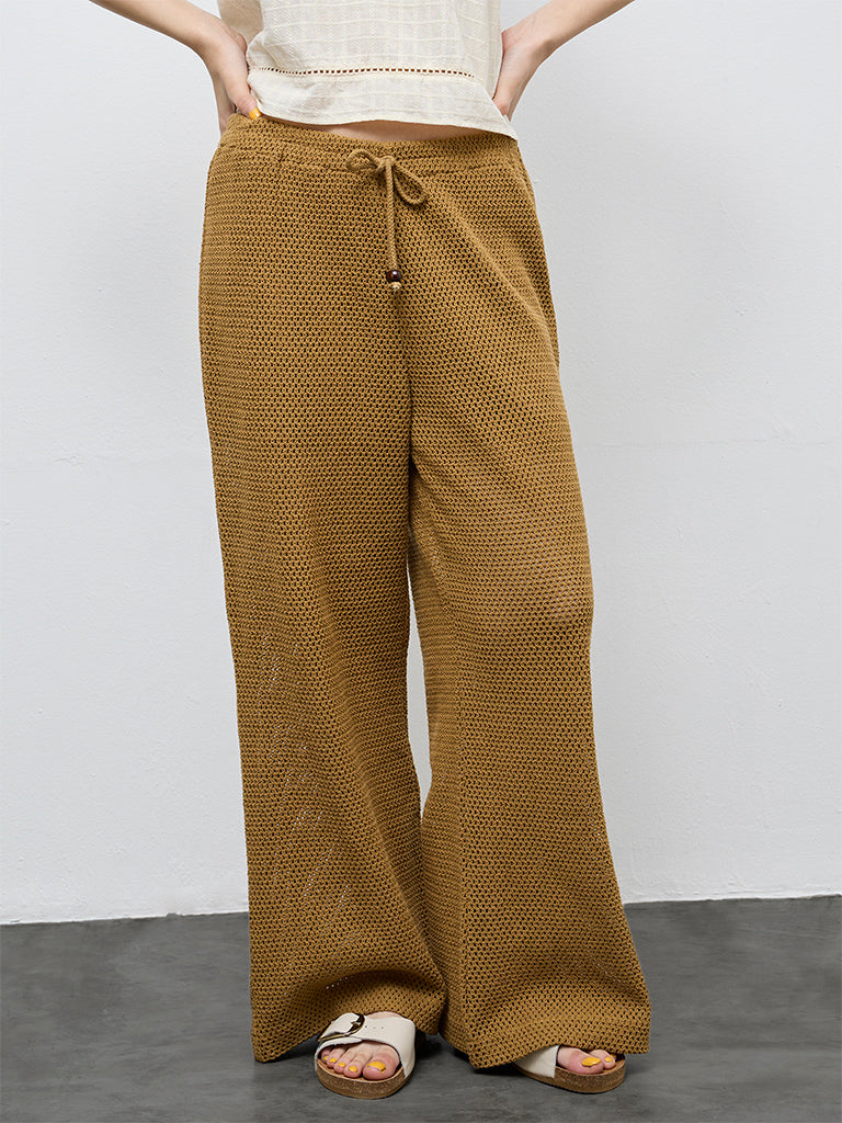 These mustard pants from Bombay Paisley brings a distinctive element to casual dressing. The high-rise silhouette is shaped with wide legs, allowing the crochet construction to fall fluidly through the length. A drawstring waistband offers adjustable comfort while keeping the look laid-back. Woven from breathable fabric, the design works well for warm-weather styling and easy daytime wear.