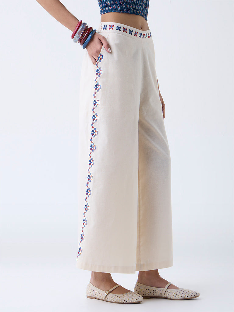 Bombay Paisley Off-White Embroidered Cotton-Blend Palazzos