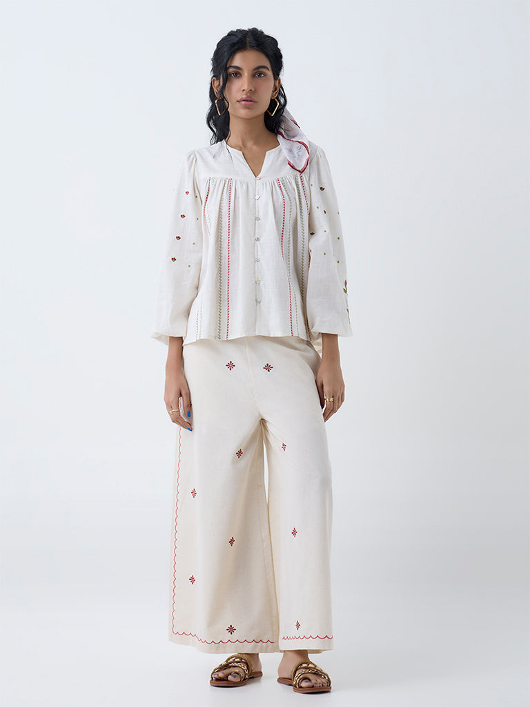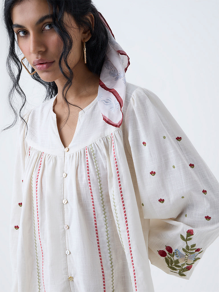 Rev up your summer wardrobe with this off-white top from Bombay Paisley. Designed with a split neck, button placket, and peasant sleeves, it highlights exquisite floral motifs for a feminine touch. Made from pure cotton with embroidered stripes on the front, it’s perfect for effortless daytime wear.
