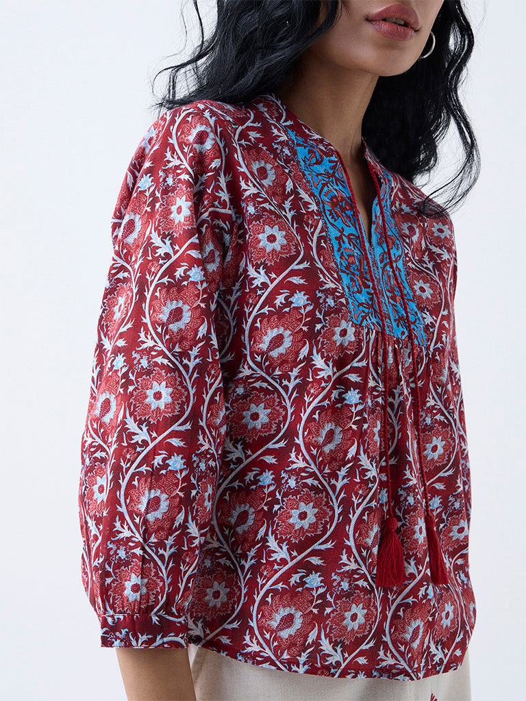 This red top from Bombay Paisley brings an effortless, boho ease to everyday dressing. Its folk-inspired foliage print adds a crafted charm, while the split neckline finished with tasseled tie-up accents introduces a soft point of interest. Blouson sleeves and a relaxed silhouette enhance its fluid shape, and the breathable cotton-rich fabric keeps the piece comfortably wearable through long, unhurried days.