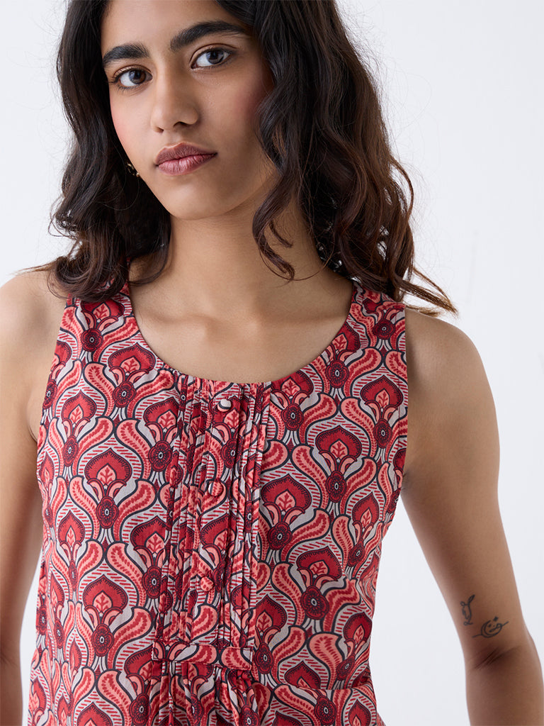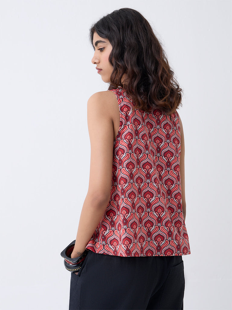 A pop of colour for everyday styling, this red top from Bombay Paisley showcases vivid ethnic prints with a refined finish. Crafted from breathable cotton, it features pintuck detailing and a short button placket that adds texture. The round neckline and sleeveless cut keep it light, comfortable and ideal for warm-weather layering.