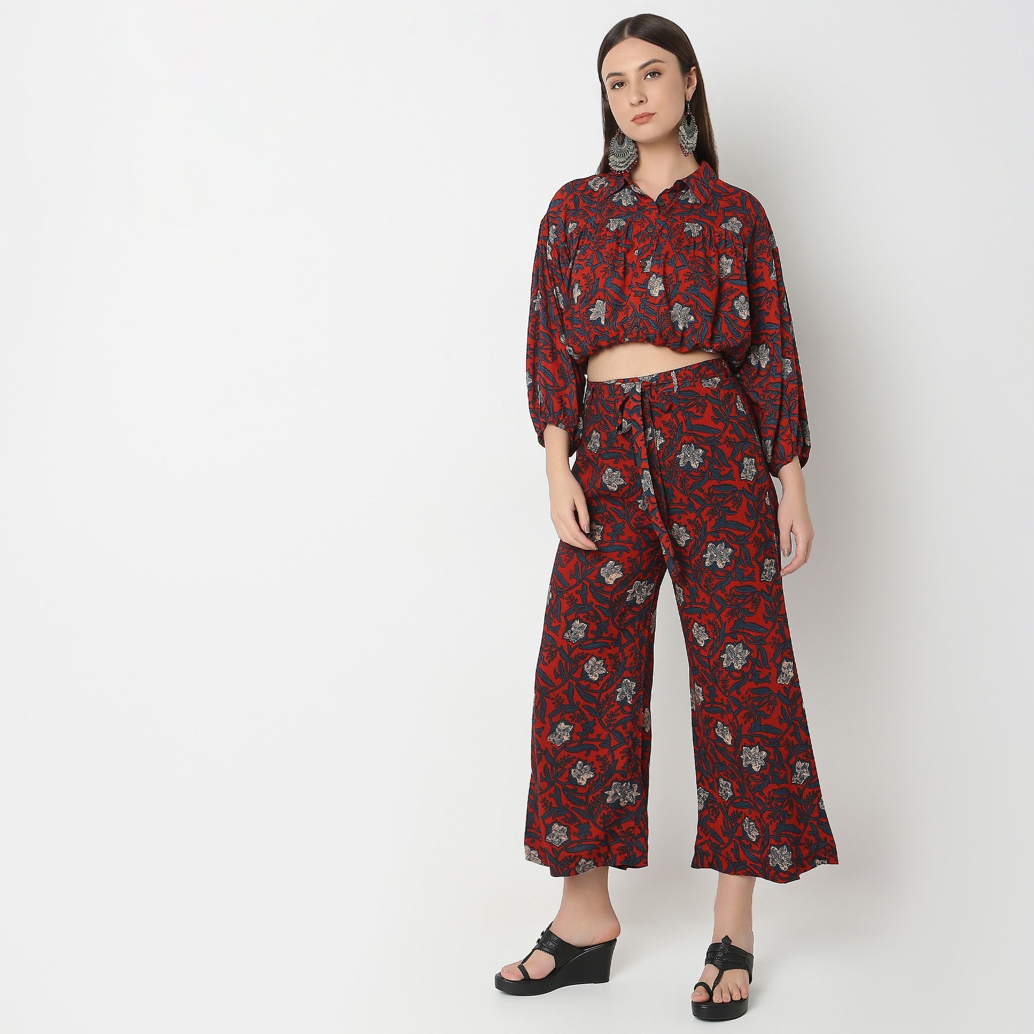 This printed pattern crop top has a camp collar and three-fourth sleeve. Made from viscose, it is soft and comfortable to wear.