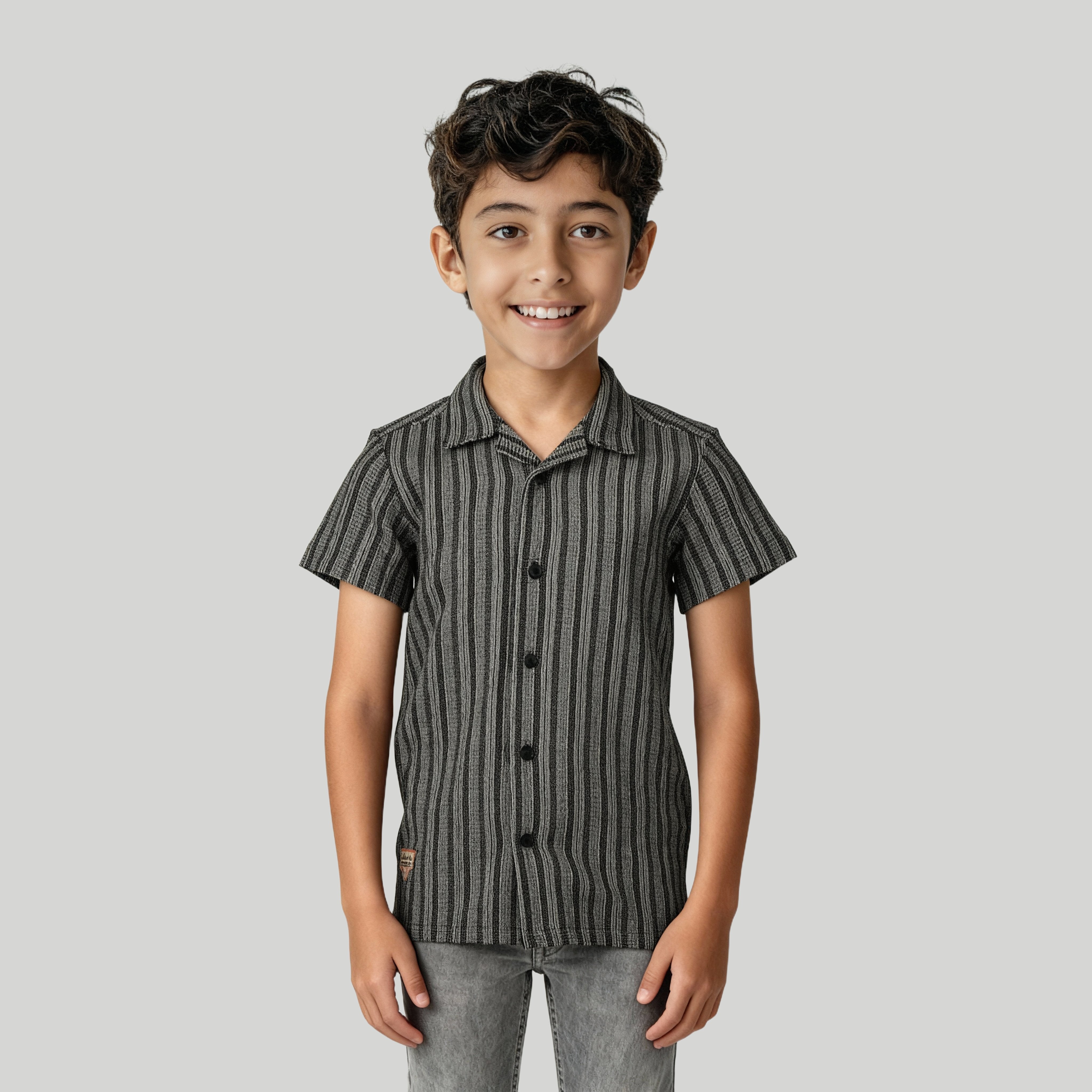 These striped pattern shirt has camp collar and half sleeve. Made from polyester cotton, your kid's feel comfortable wearing the product.