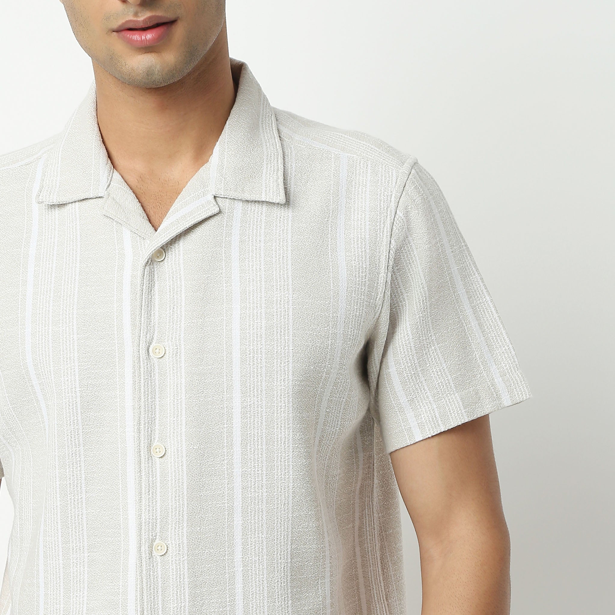 Experience the perfect blend of comfort and style with our Regular Fit Solid Camp Collar Shirt. Crafted from 100% cotton, this shirt offers a soft touch against your skin, ensuring you stay comfortable throughout the day. Its solid pattern and woven texture make it a versatile addition to any wardrobe, suitable for both casual outings and more formal occasions.