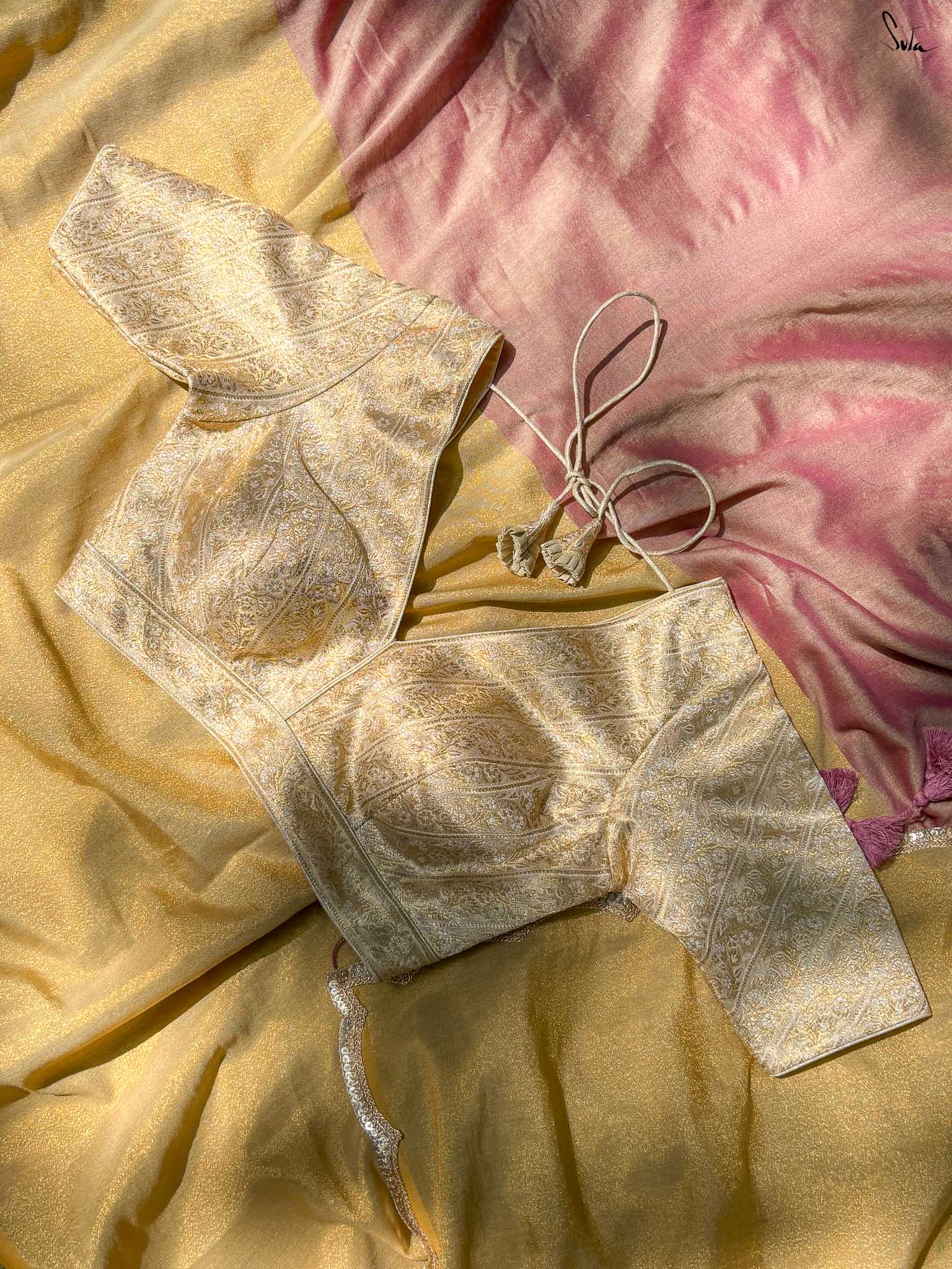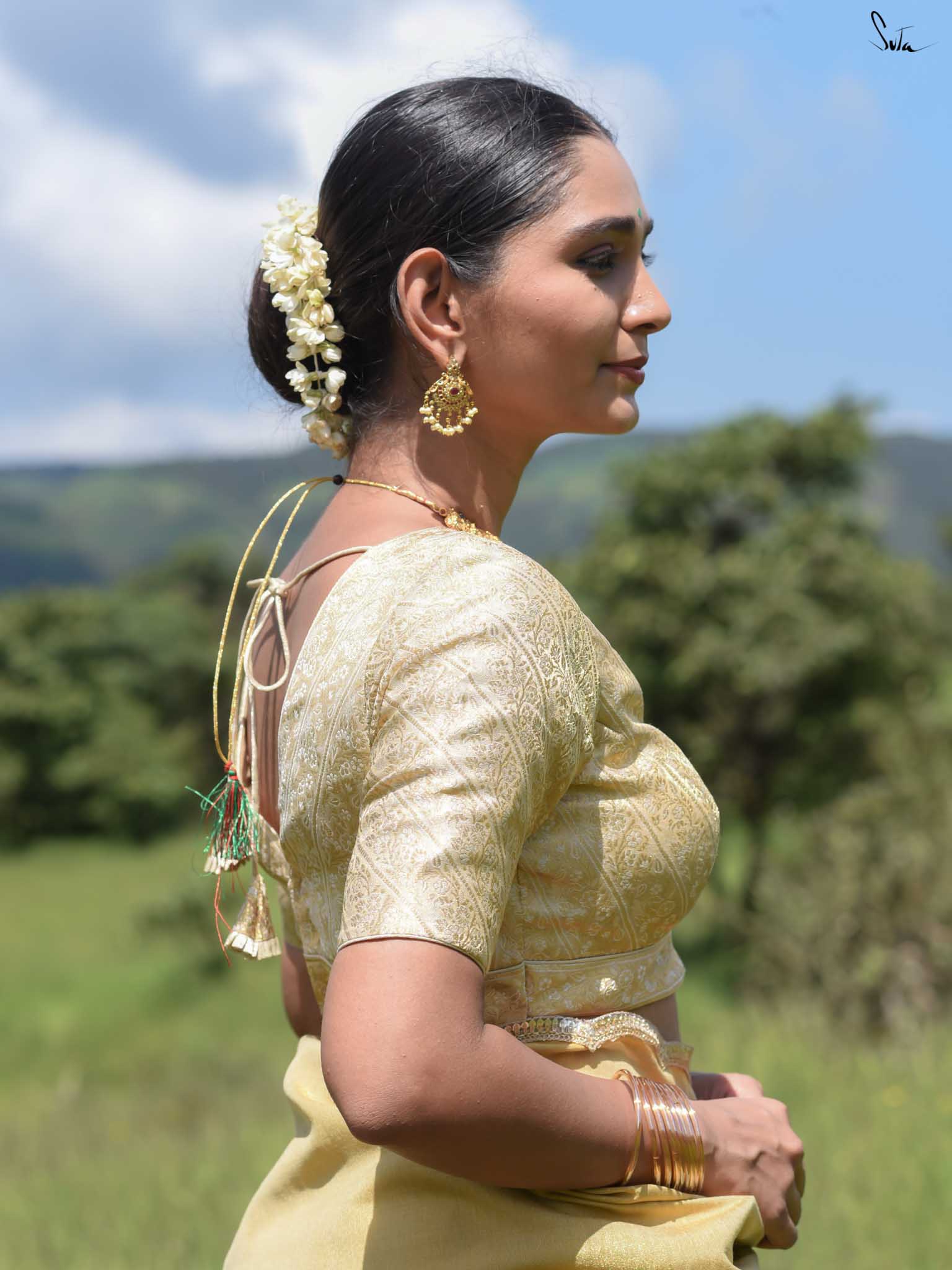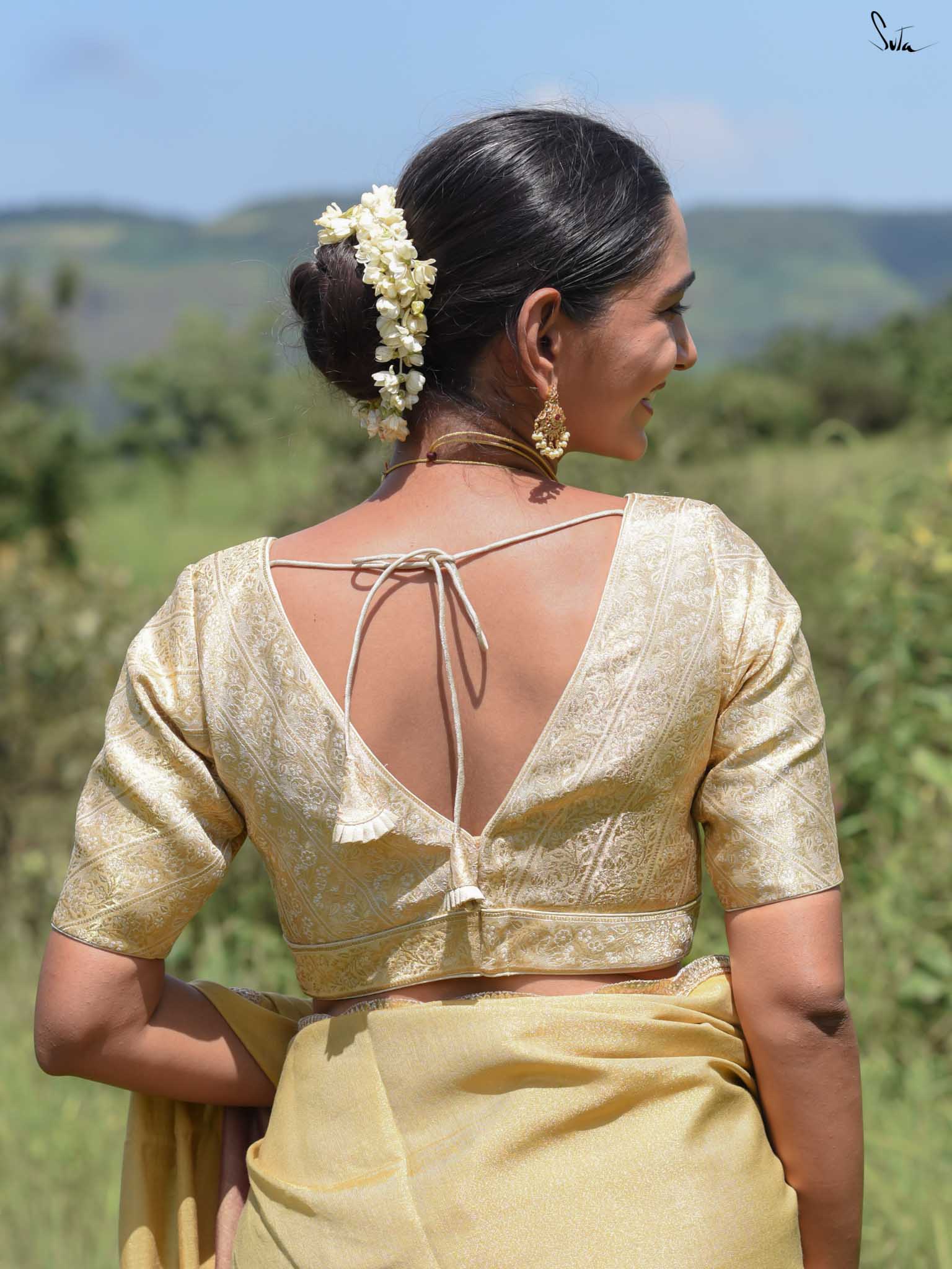 Elegant, radiant, and timeless, the Champagne Gold adds a subtle shimmer to any saree look. Crafted from luxurious brocade fabric, this blouse features intricate floral embroidery, a flattering V-neckline, and half sleeves for a classic appeal. The back-open design with hook closure ensures comfort while maintaining a graceful fit. Perfect for weddings, festive celebrations, or evening occasions, it’s a versatile addition to your festive wardrobe.