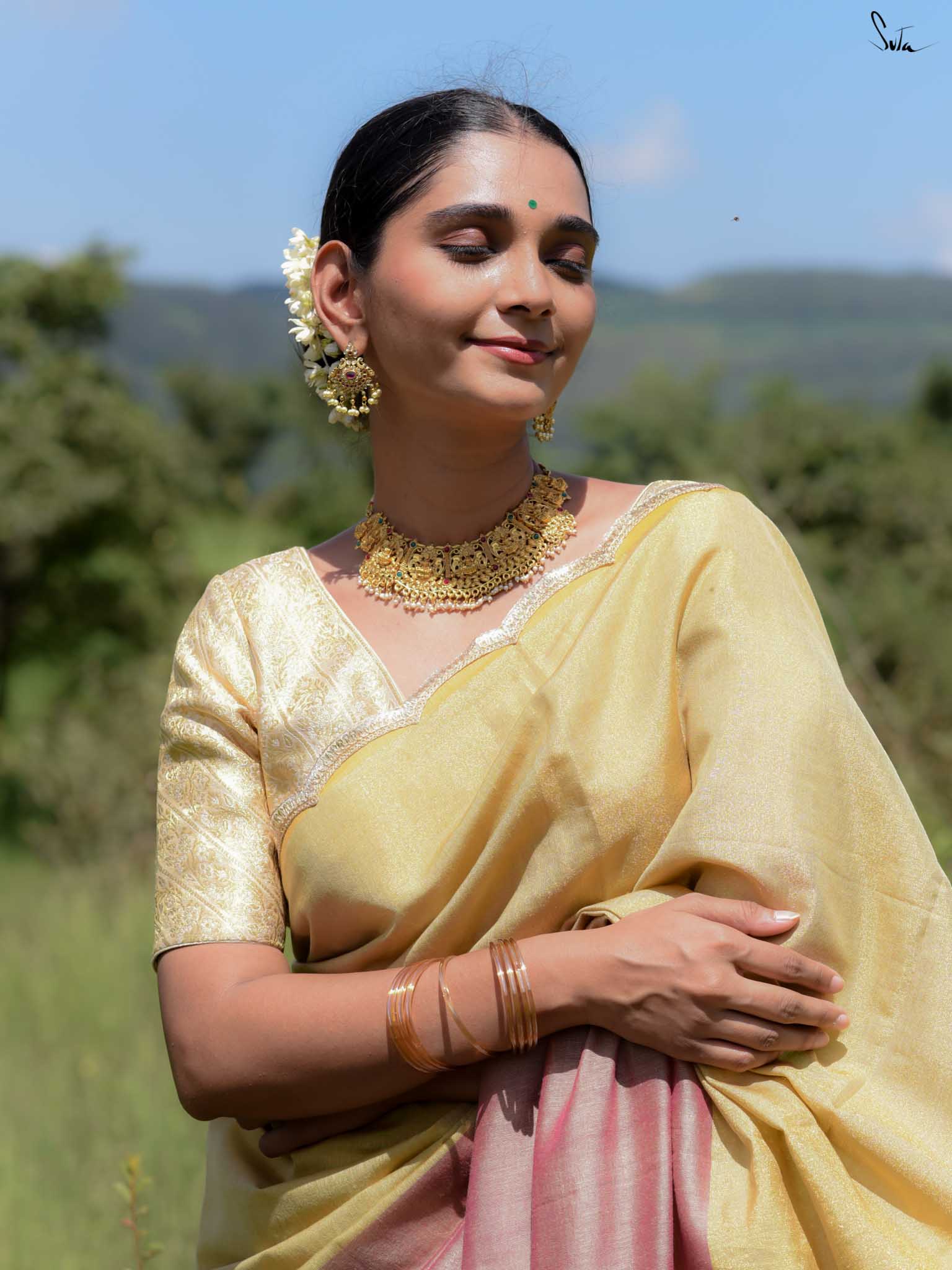 The model is wearing a size S blouse and the saree is Dipped in Mauve.