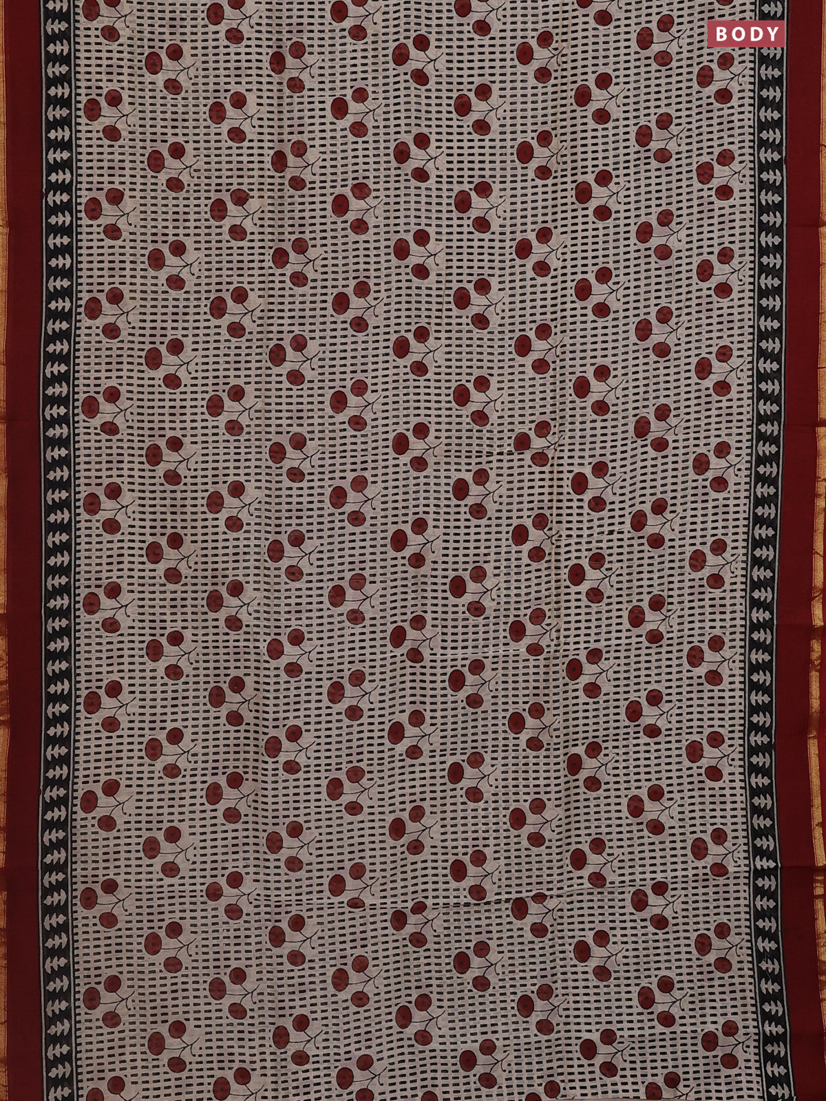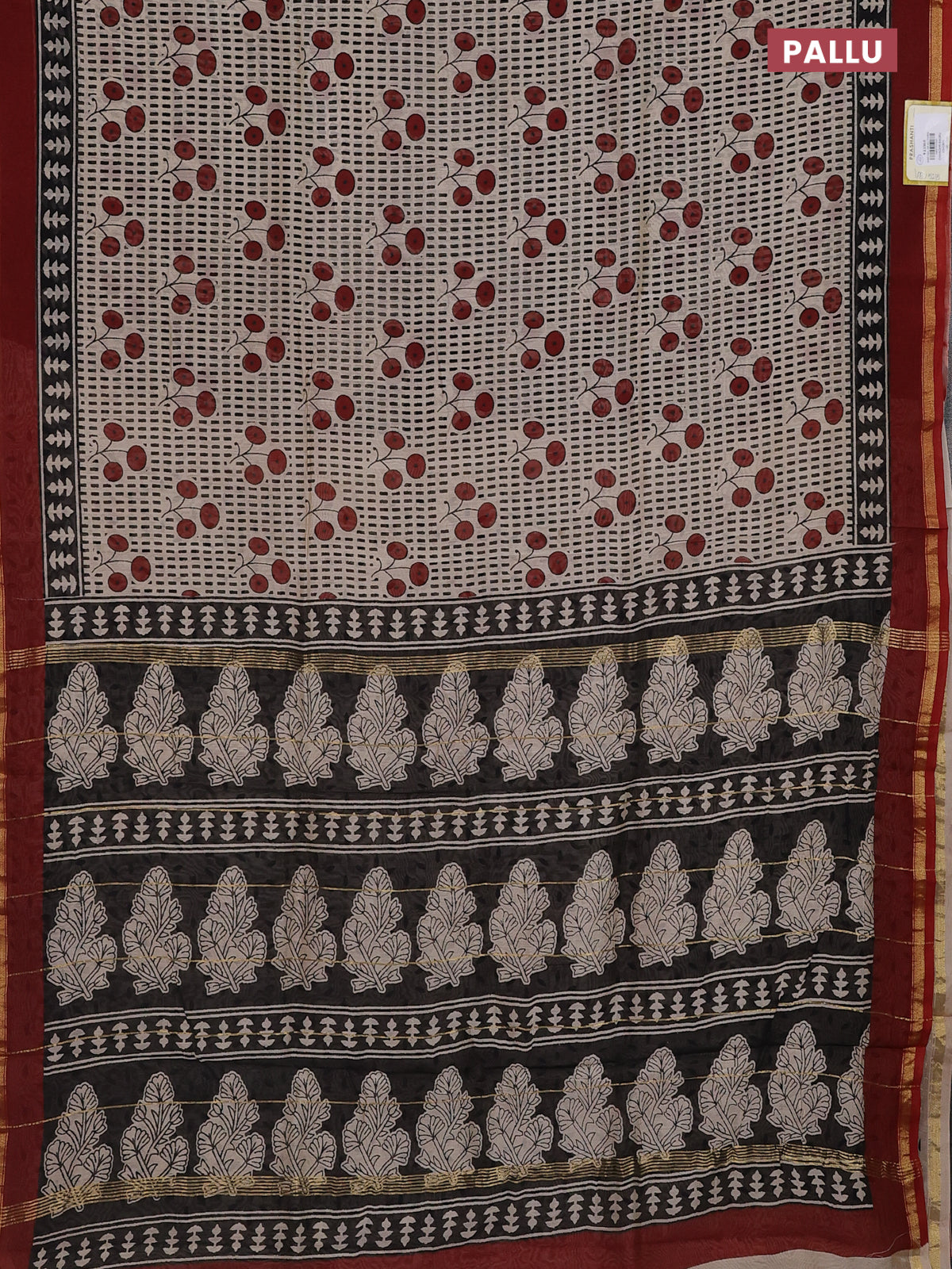 Chanderi bagru saree beige black and maroon with allover prints and small zari woven border