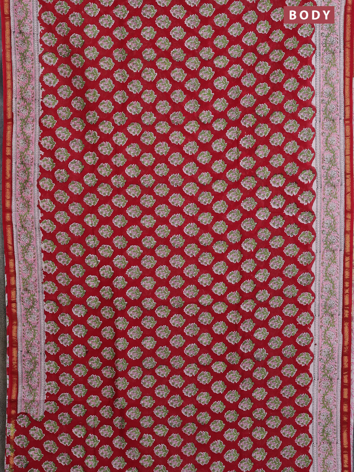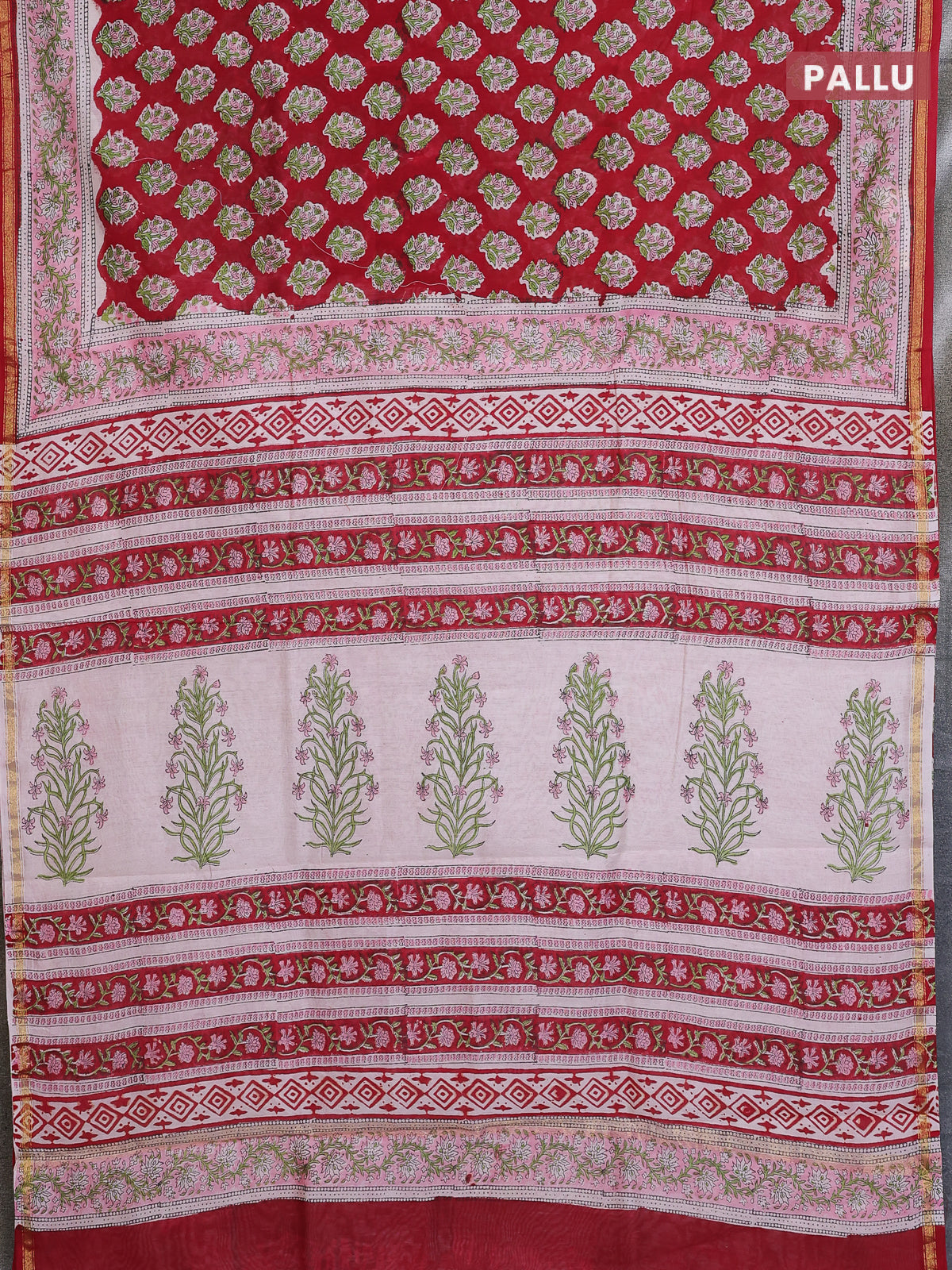 Chanderi bagru saree red and light pink with allover butta prints and small zari woven border