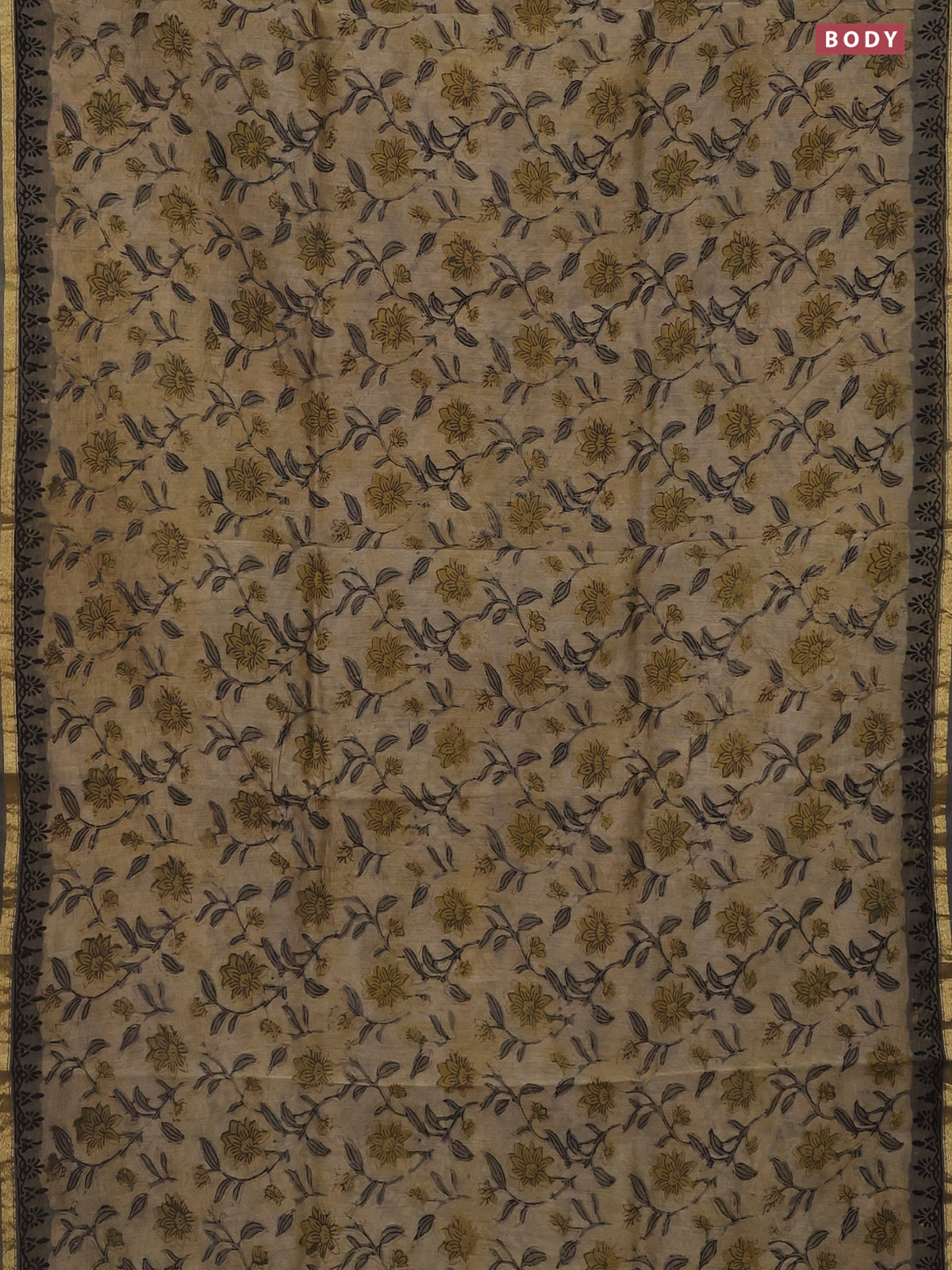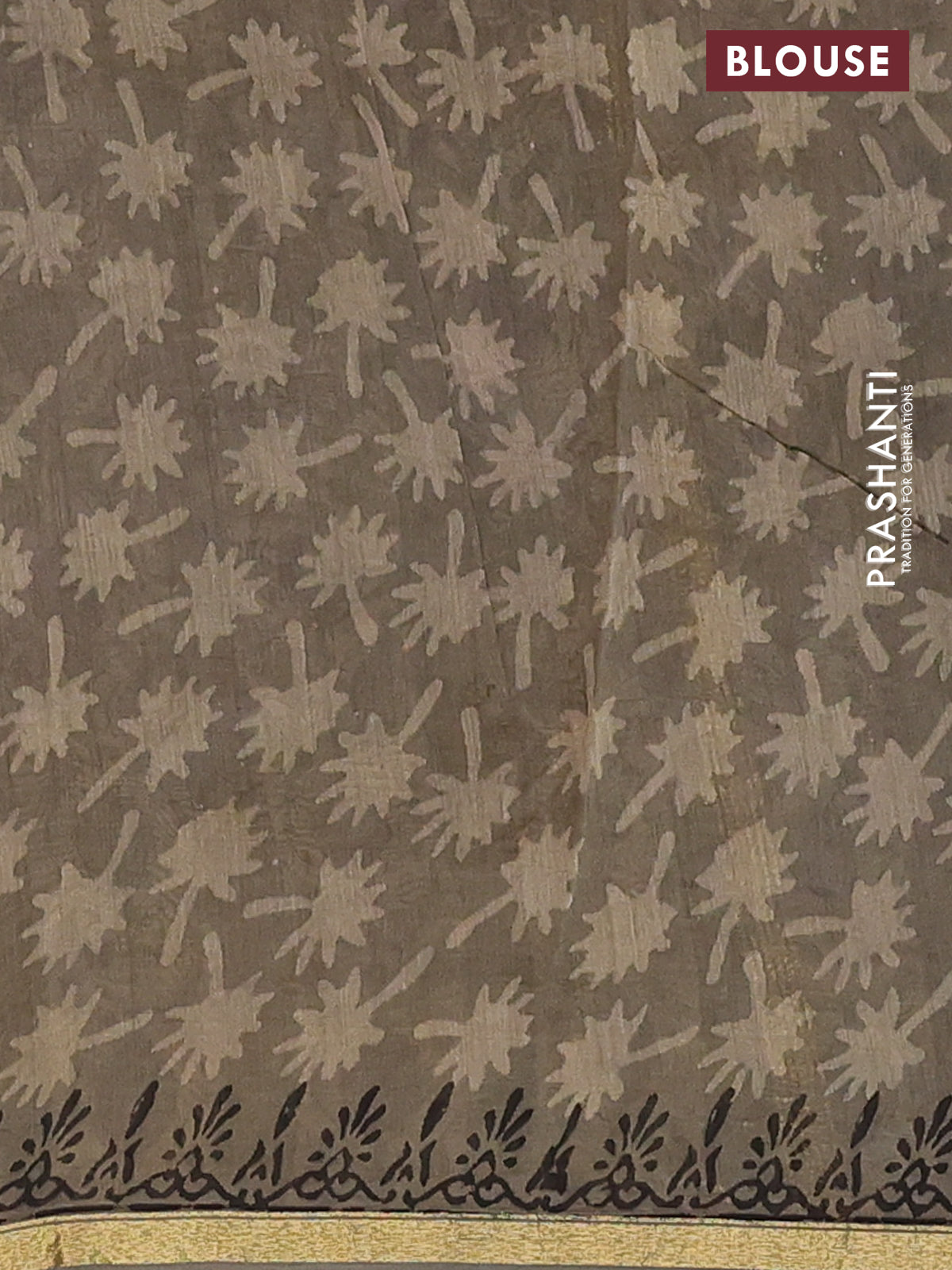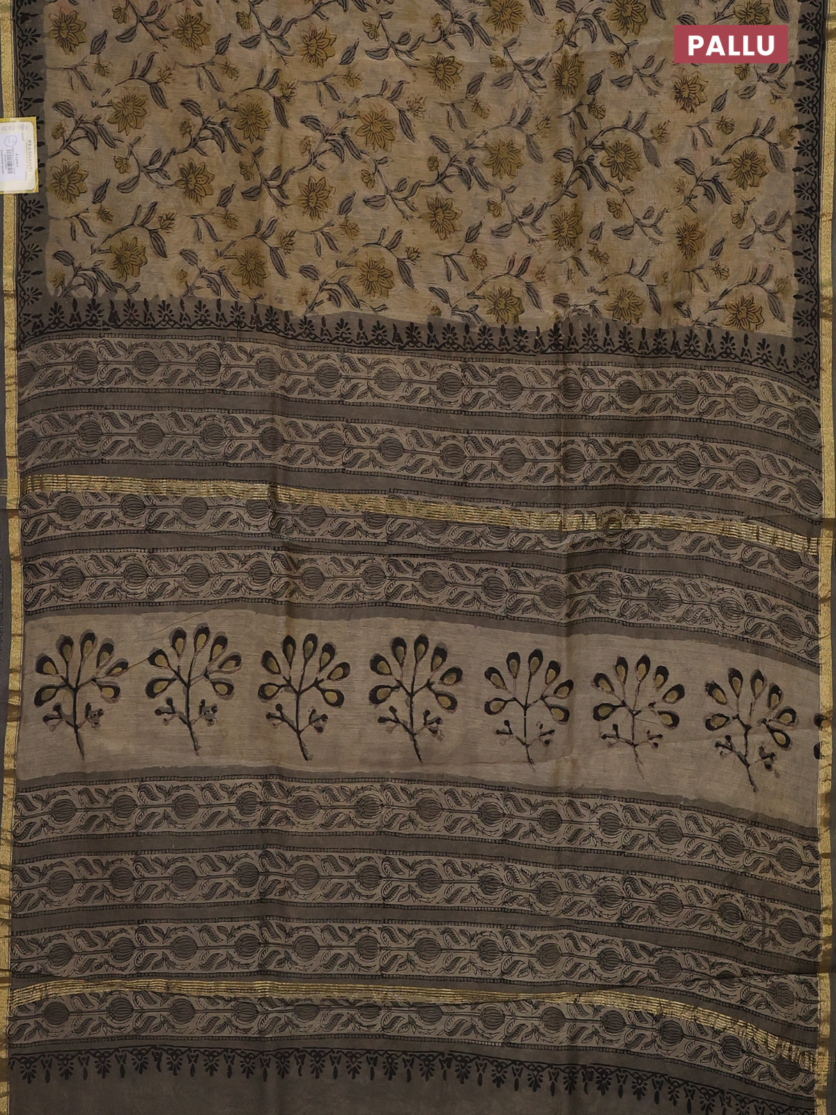 Chanderi bagru saree sandal and grey with allover prints and small zari woven border