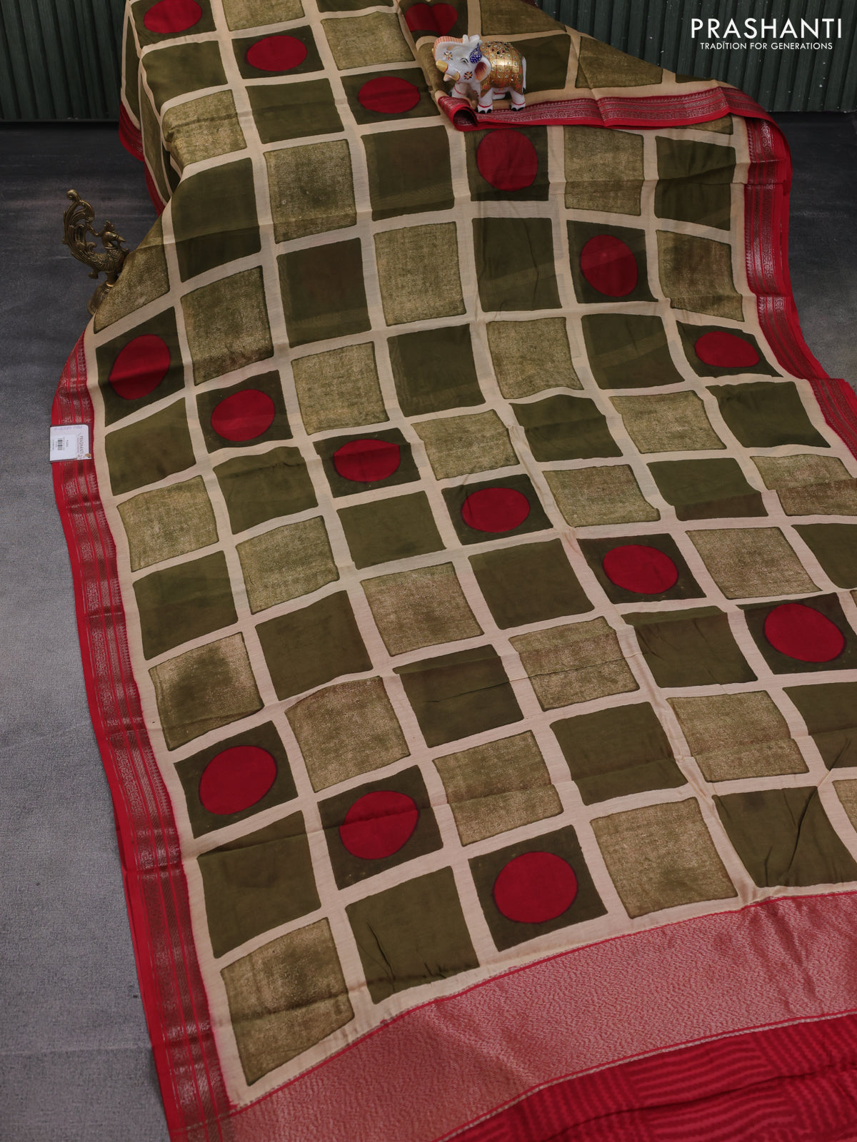 Chanderi silk cotton saree sandal sap green and red with allover geometric prints and banarasi style border