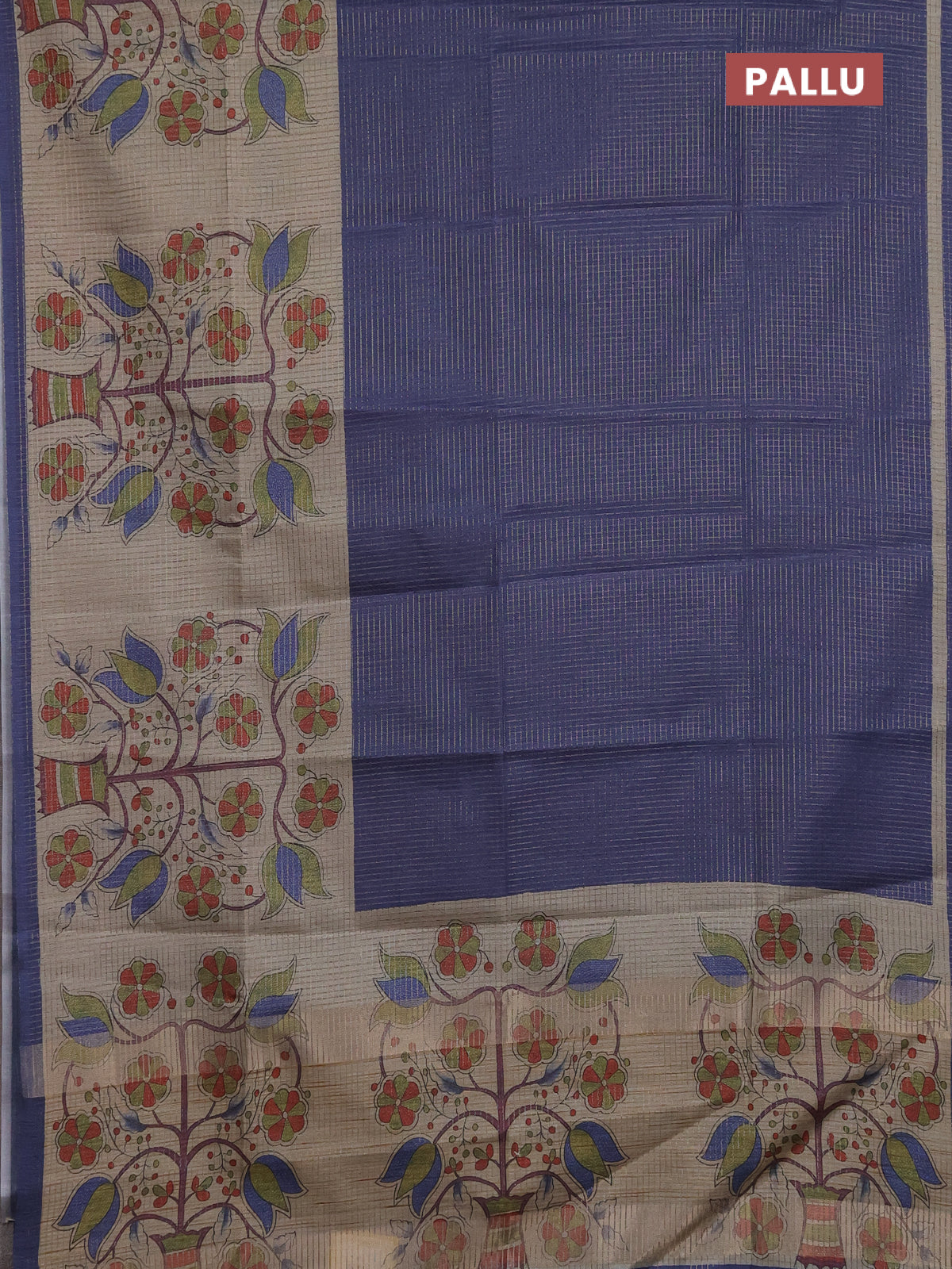 Chappa saree dark blue and beige with allover small zari checked pattern and floral digital printed pallu
