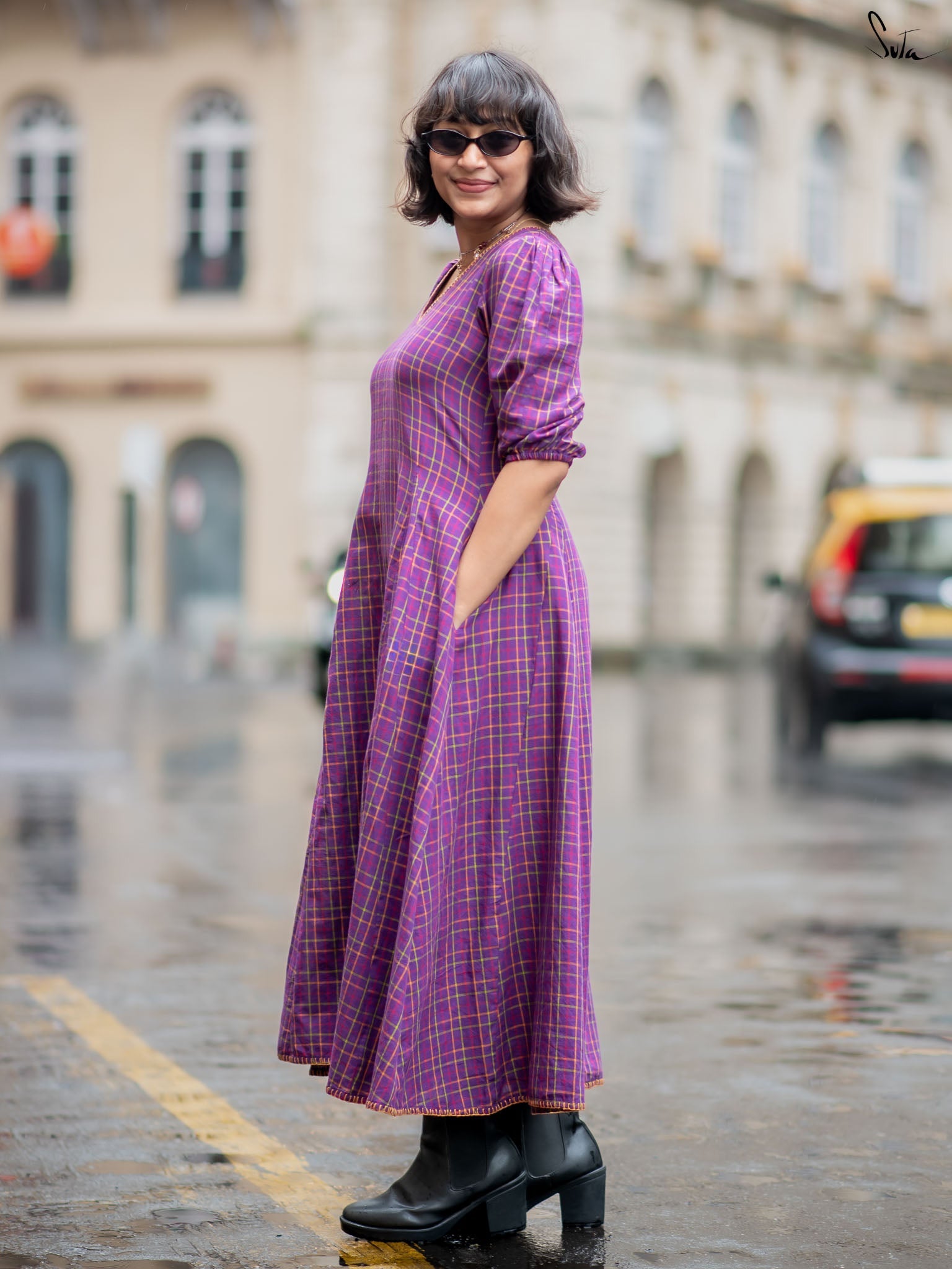 Checks with a twist! This purple cotton midi dress redefines a classic in V-neckline with  contrasting mustard blanket stitches, a design detail that subtly draws attention. The breathable cotton keeps it summer-ready, while the puff sleeves and easy flare make it an all-day comfort pick. It’s your go-to for market strolls, casual catch ups, or just feeling cute on a weekday.