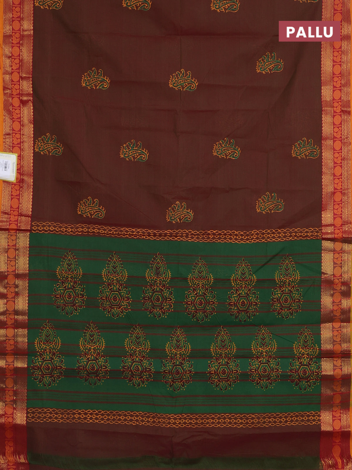 Chettinad cotton saree dual shade of greenish maroon and dark mustard with butta prints and zari woven border