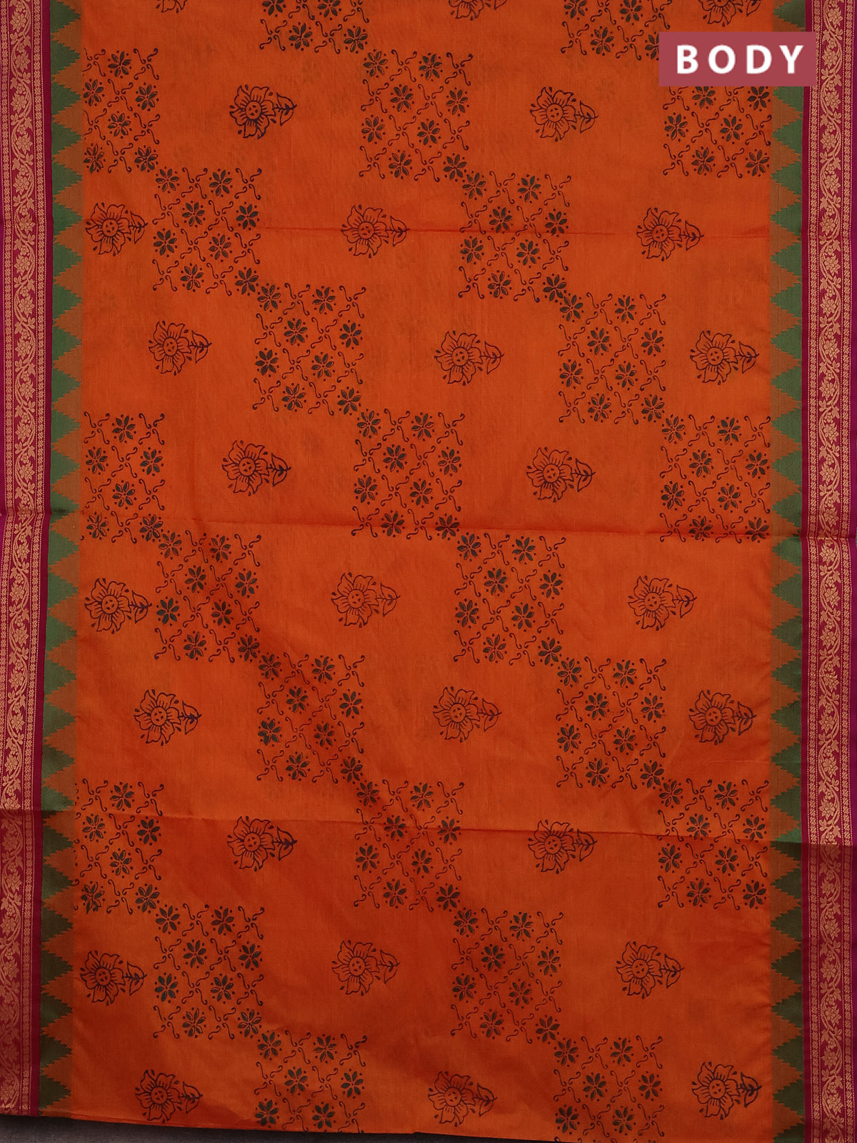 Chettinad cotton saree orange and dark pink with allover block prints and thread woven border