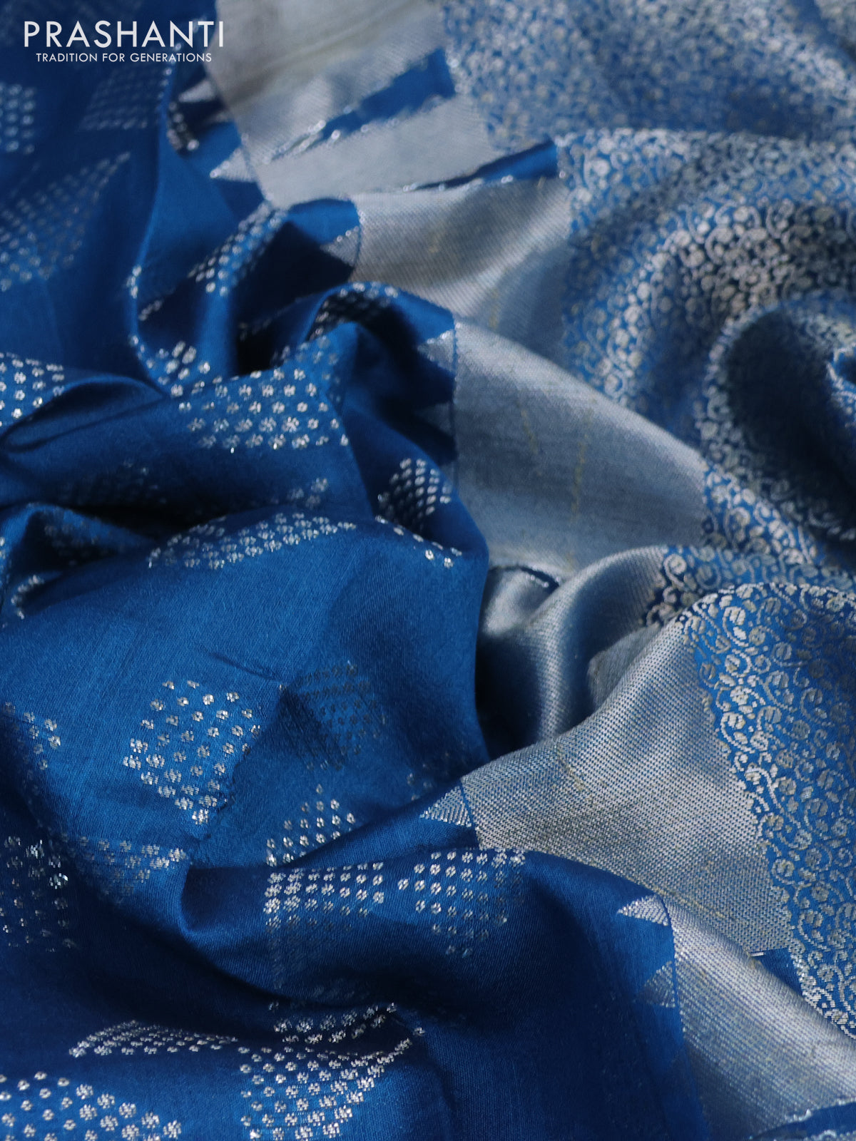 Chiniya silk saree cs blue with allover silver zari weaves and temple design zari woven border