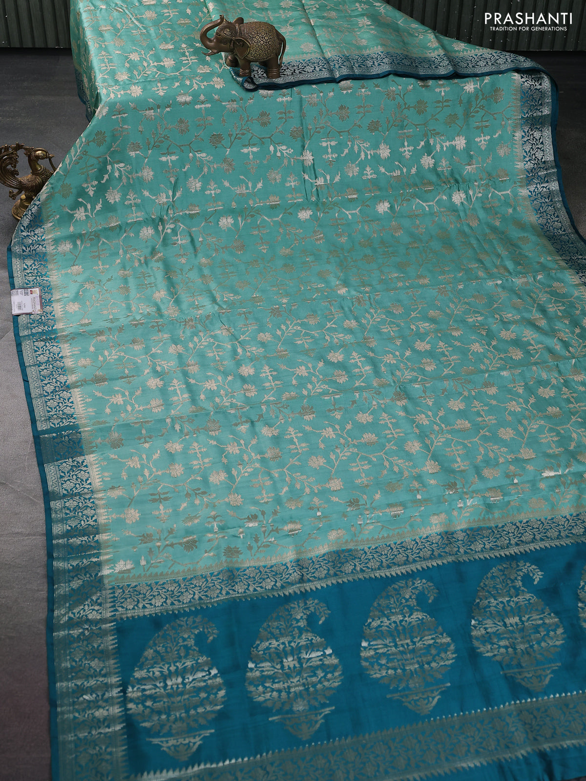 Chiniya silk saree pastel green and peacock green with allover zari weaves and zari woven border