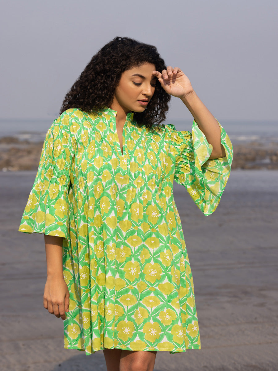 Claire Hand Block Printed Cotton Pintuck Dress