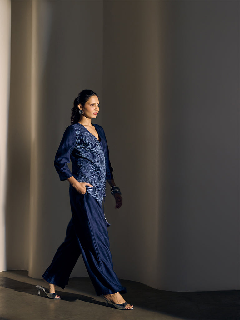 Set the mood for understated evenings with this navy co-ord set that feels easy yet intentional. The jacket features intricate embroidered detailing at the front, adding depth and texture to its wrap-inspired silhouette. Designed for comfort without compromising style, the coordinating pants come with an elasticated waistband and functional side pockets for effortless wear. Worn together, the set offers a relaxed confidence that moves seamlessly from intimate gatherings to after-dark plans.