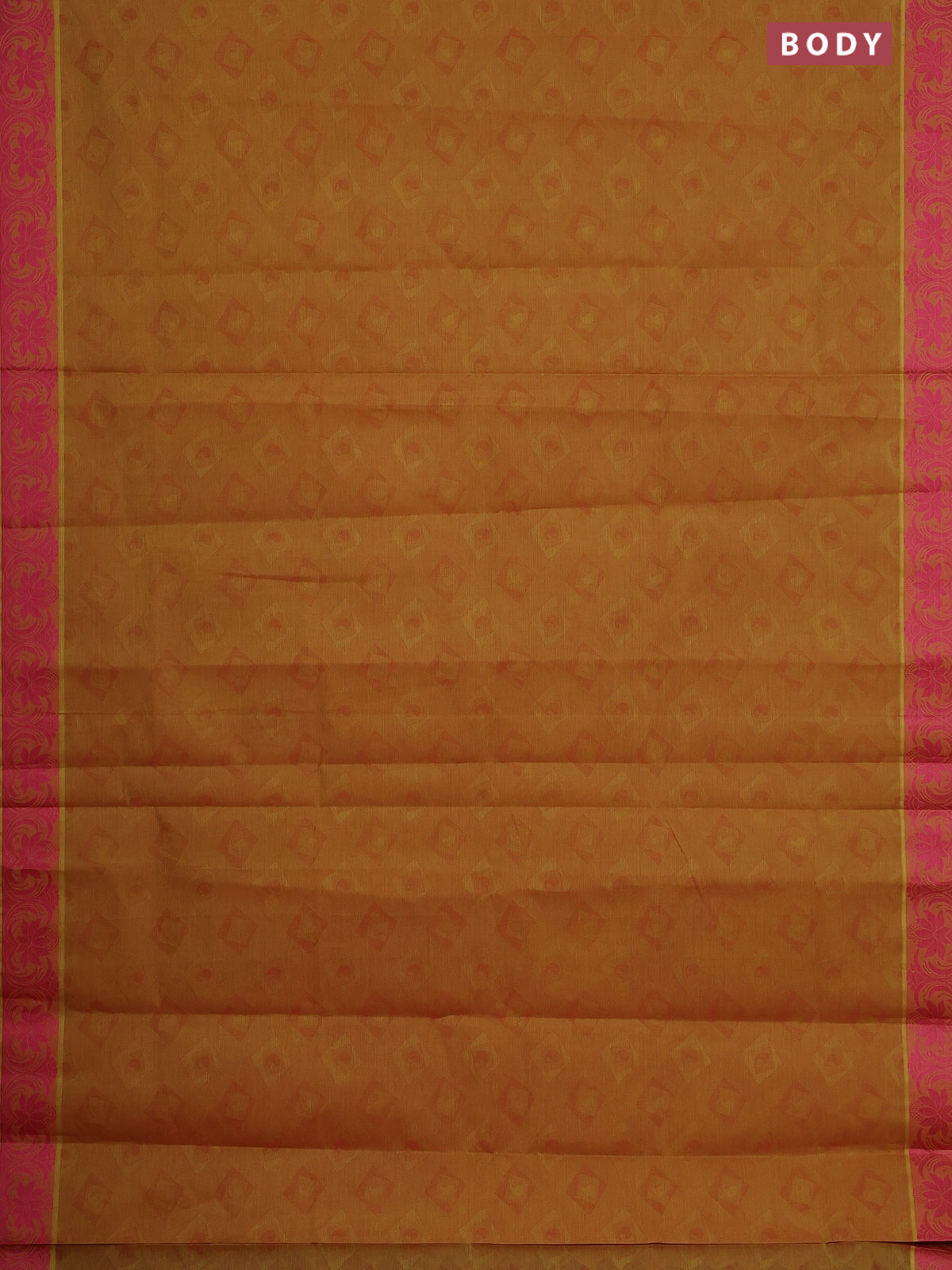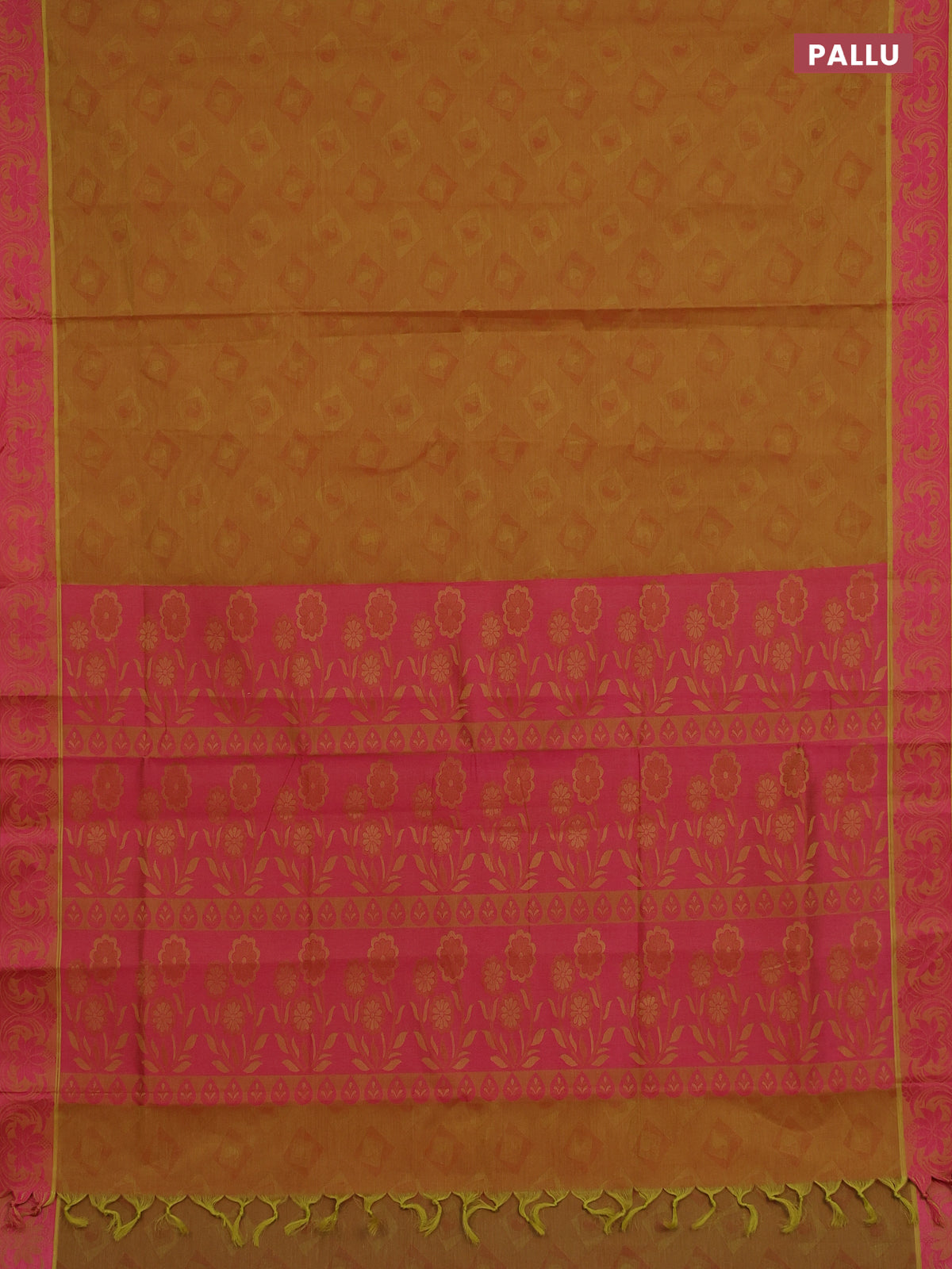 Coimbatore cotton saree dual shade of mustard yellow and pink with allover self emboss and thread woven border