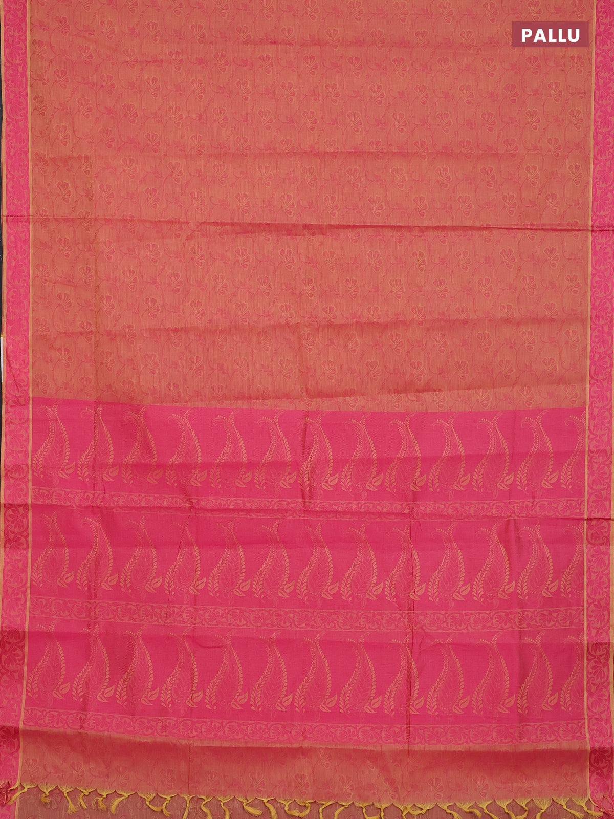 Coimbatore cotton saree dual shade of pinkish yellow and pink with allover self emboss and thread woven border