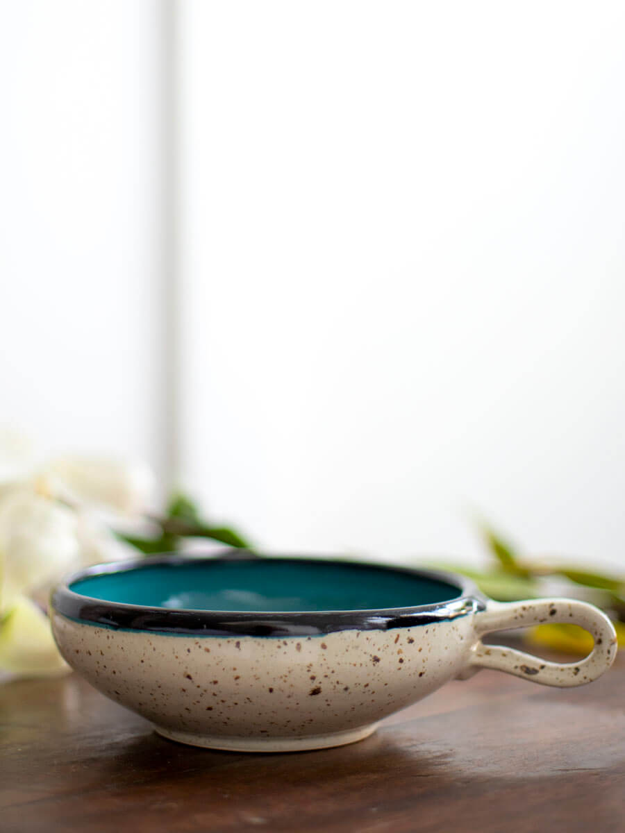 - Hand-thrown, glazed ceramic wide bowl with handle