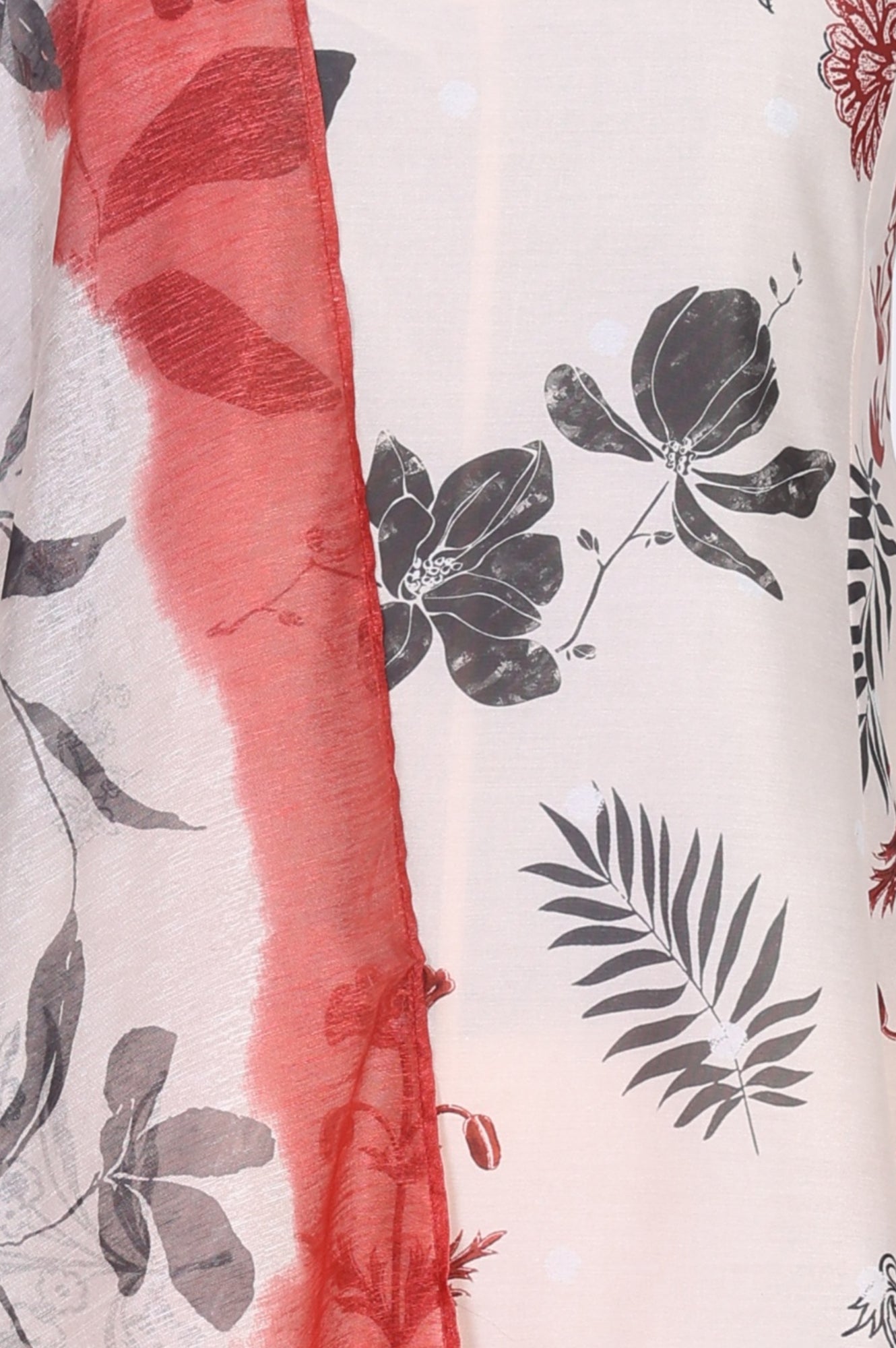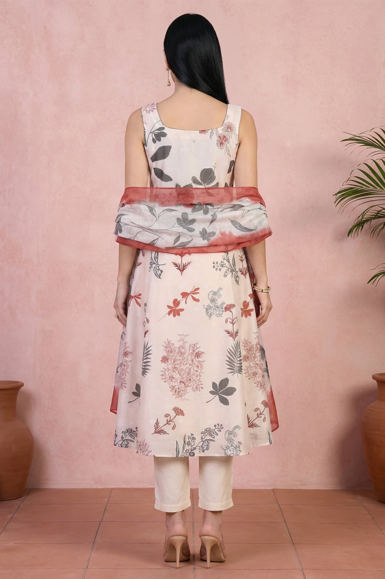 Cream Chanderi floral print A-line kurta set with straight pants and a printed dupatta, finished with subtle embroidery and foil accents. The sleeveless square-neck kurta falls to calf length with side slits for easy movement, while the ankle-length pants keep the look clean and modern. A lightweight pick for casual summer days in Indian ethnic wear.