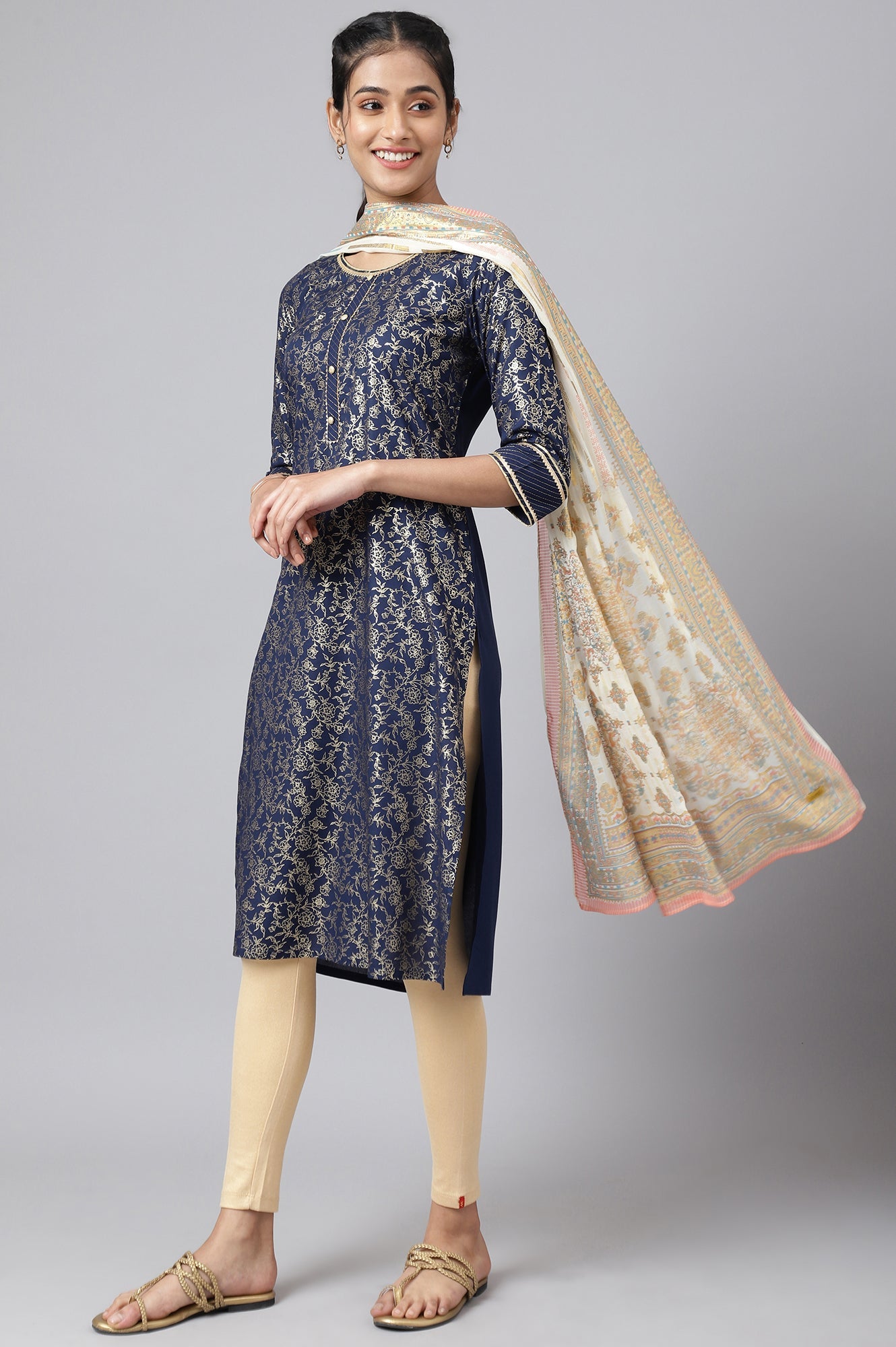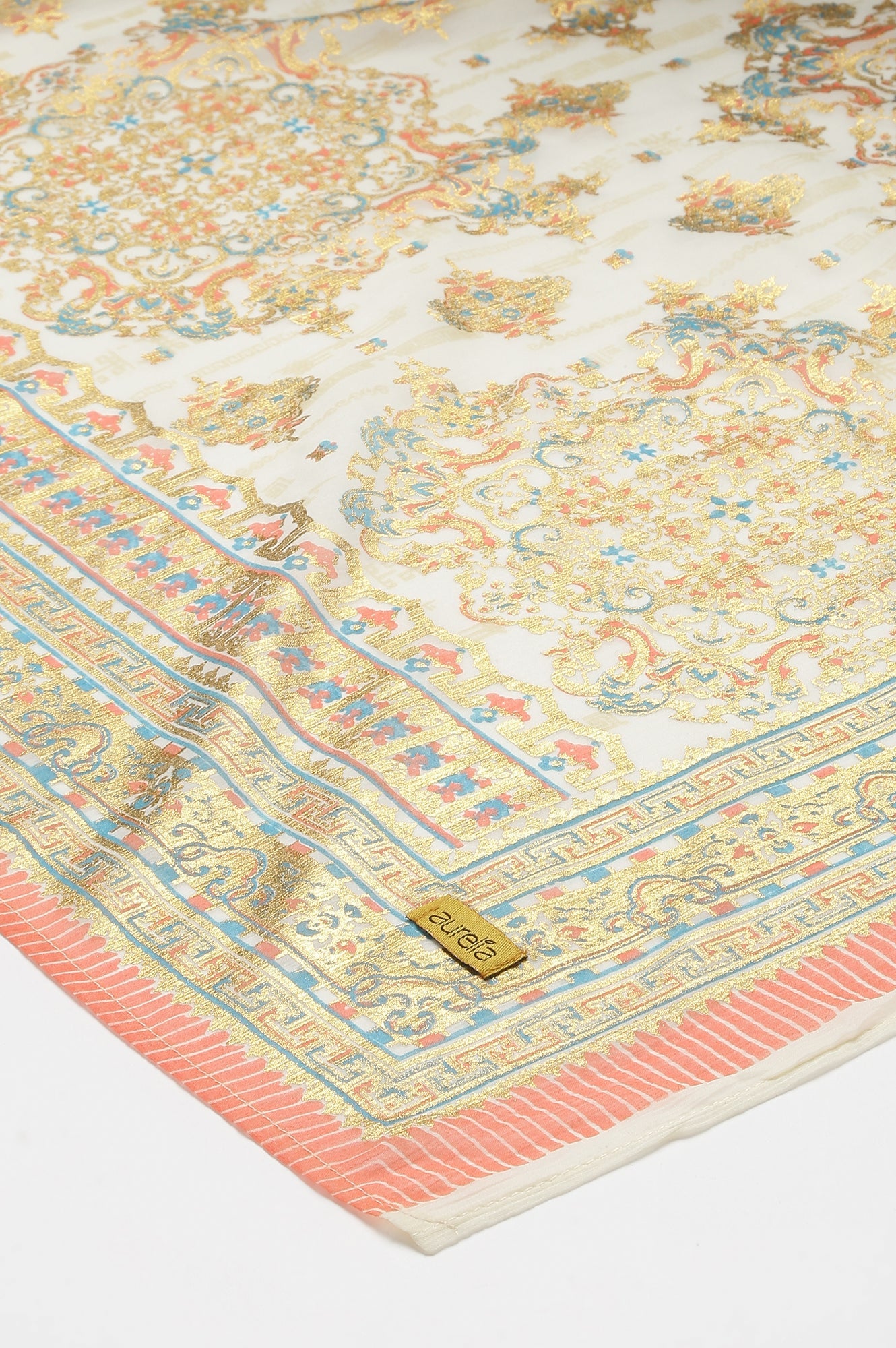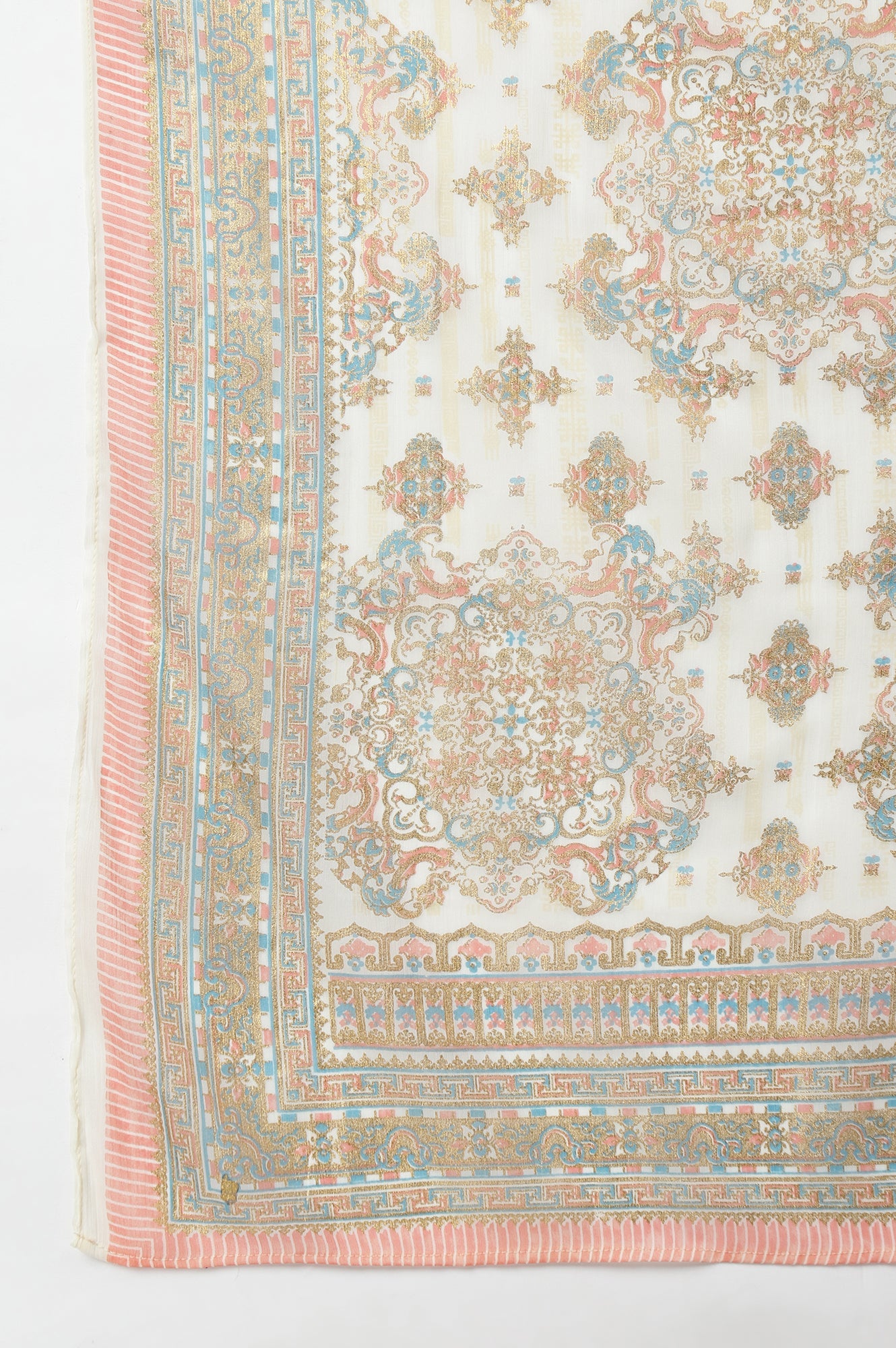 This placement dupatta is an amalgamation of florals and geometric design merging swiftly from both ends towards the centre. Harmonious mixing of colours makes it a versatile piece to pair it with a lot of kurtas.