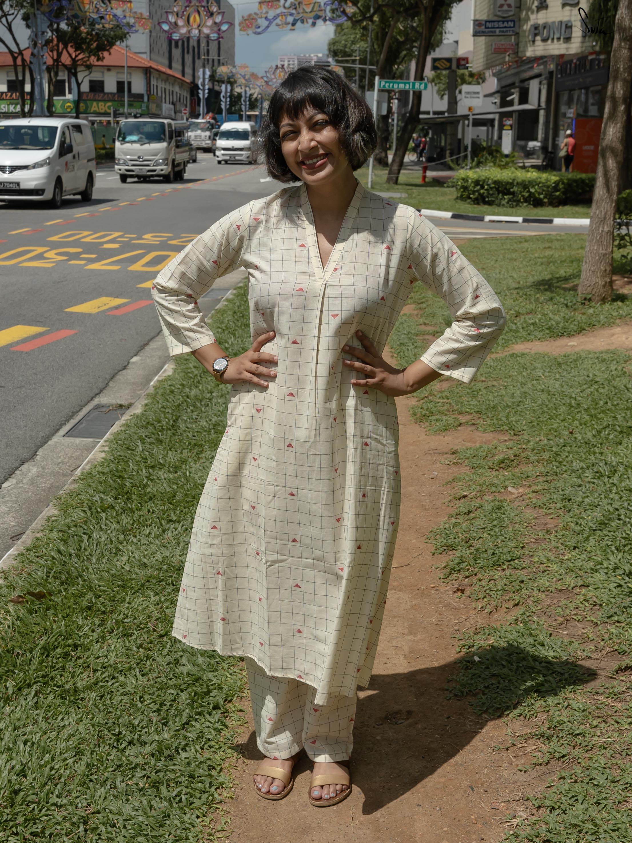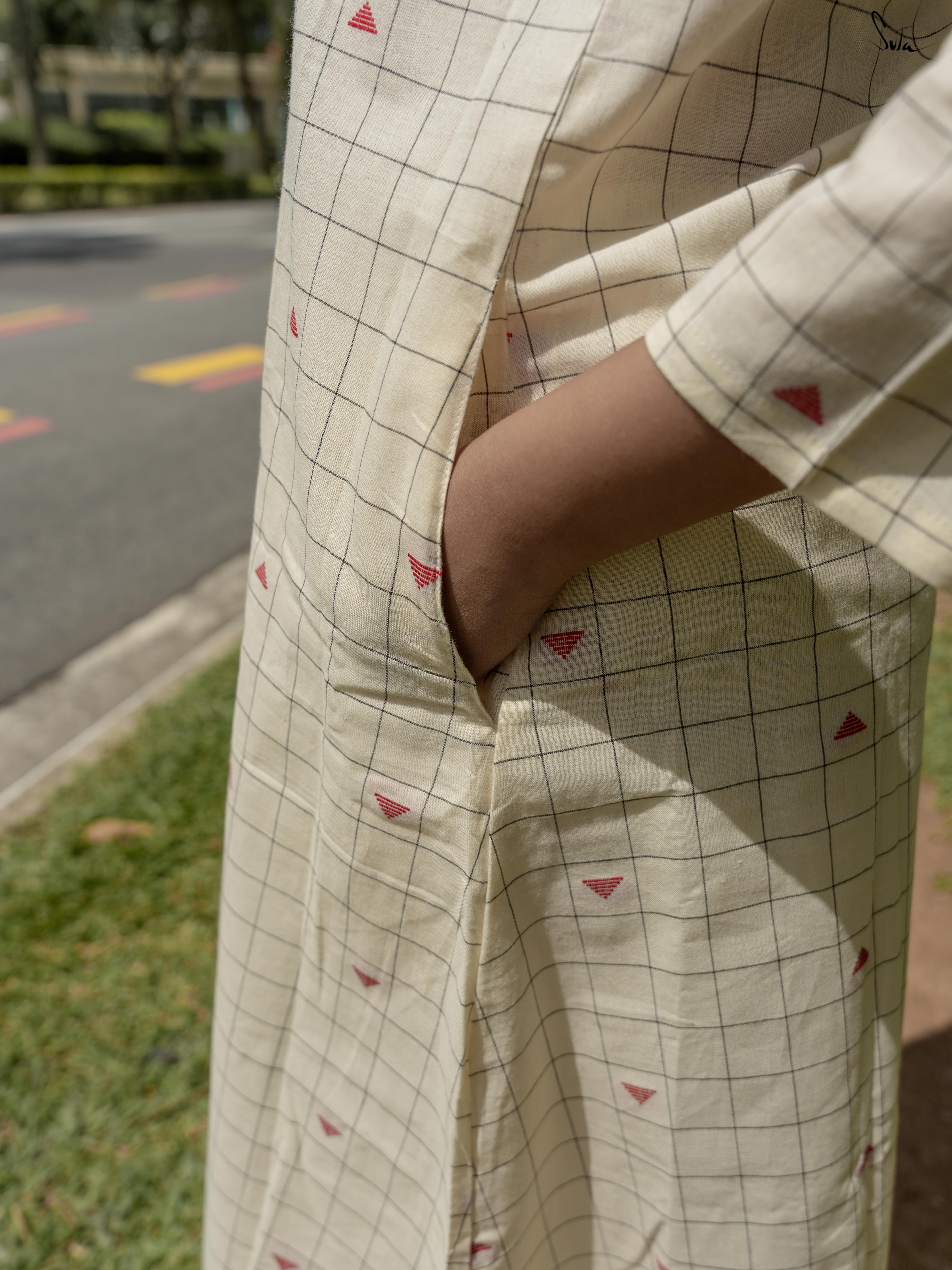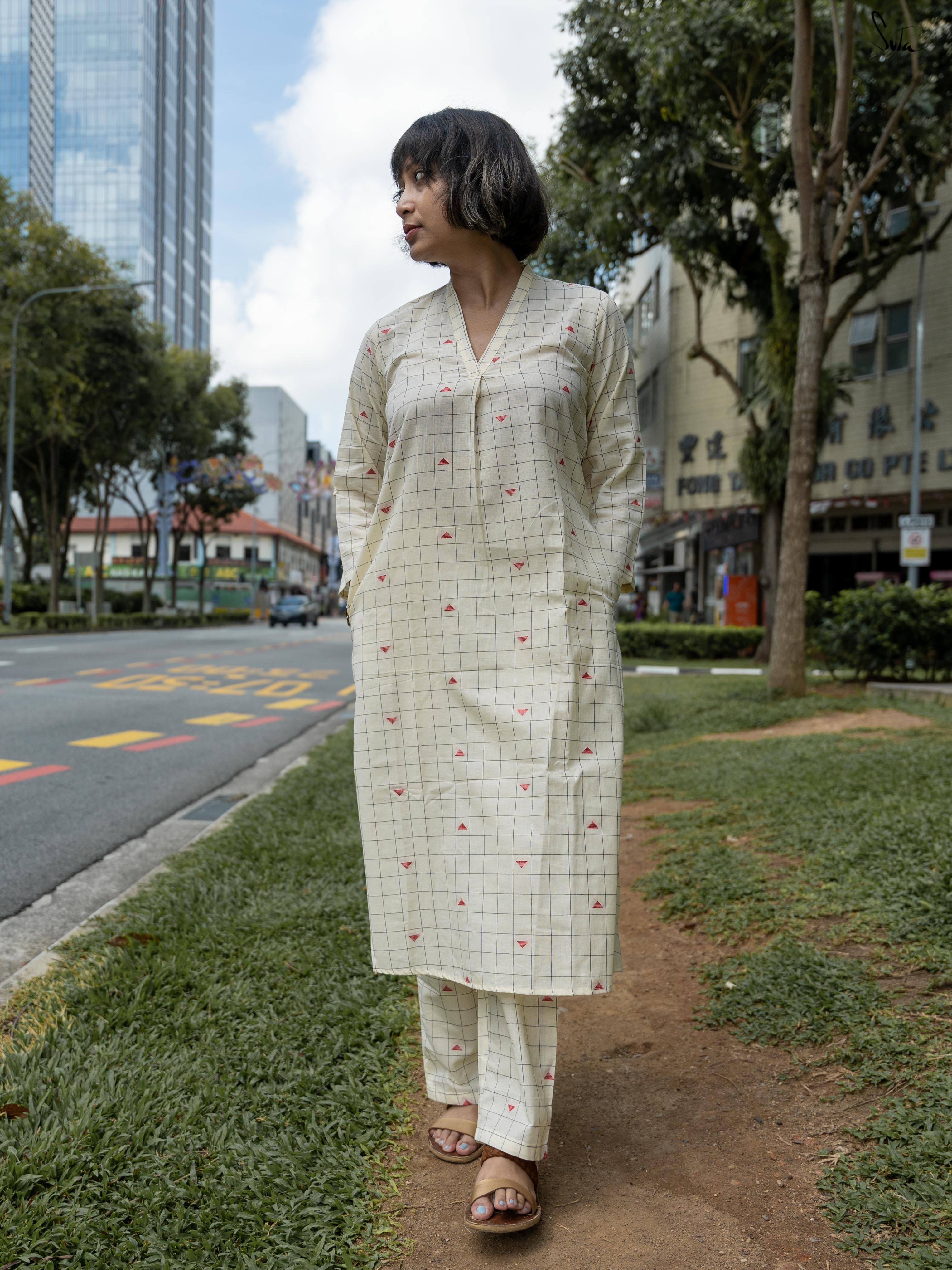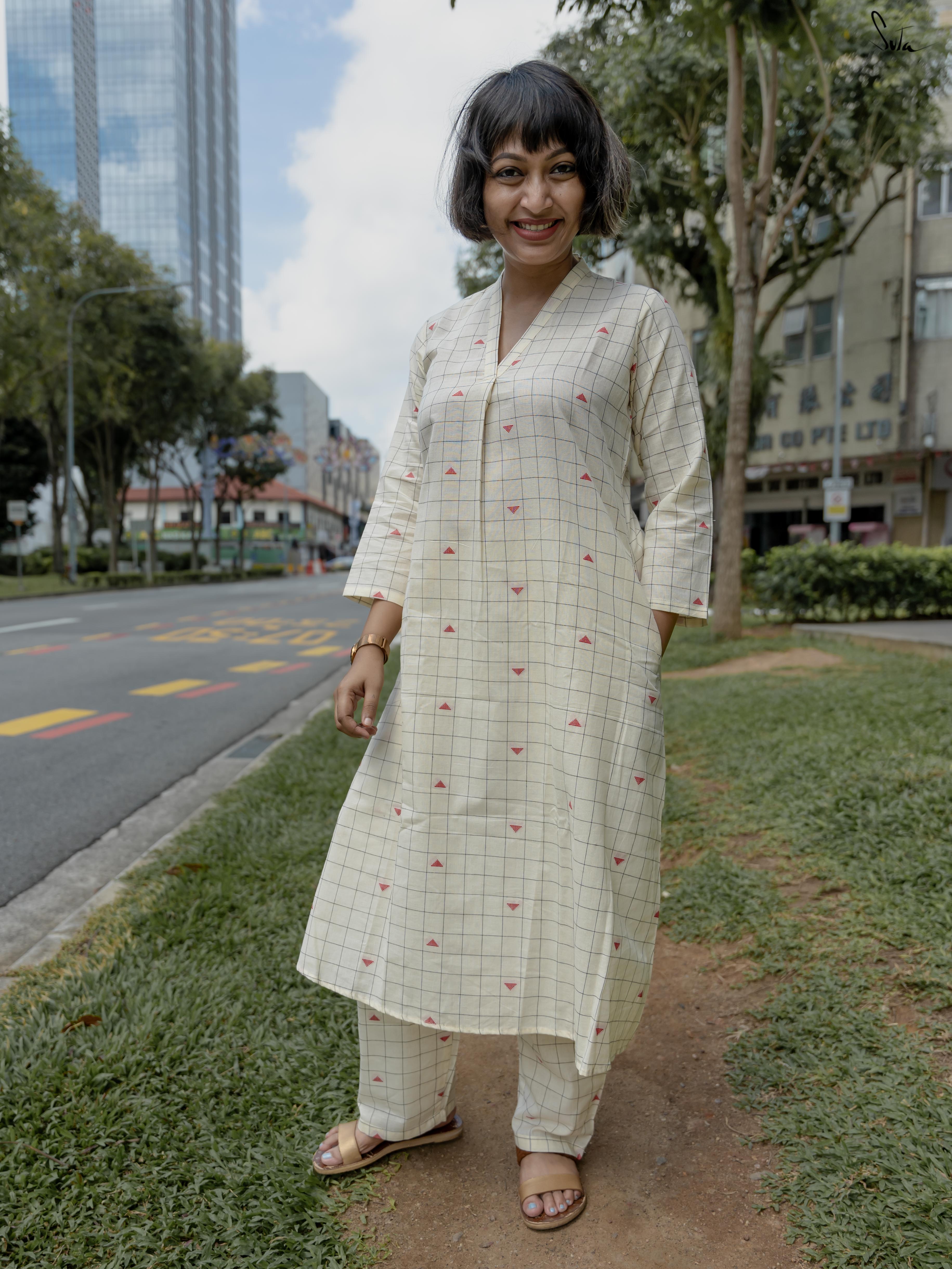 Soft and serene, Creamy Checks is a white cotton co-ord set that feels like a gentle breeze. The boat neckline and pockets add modern flair. Perfect for brunches or minimalist gatherings. Style with sleek gold accessories and understated flats.