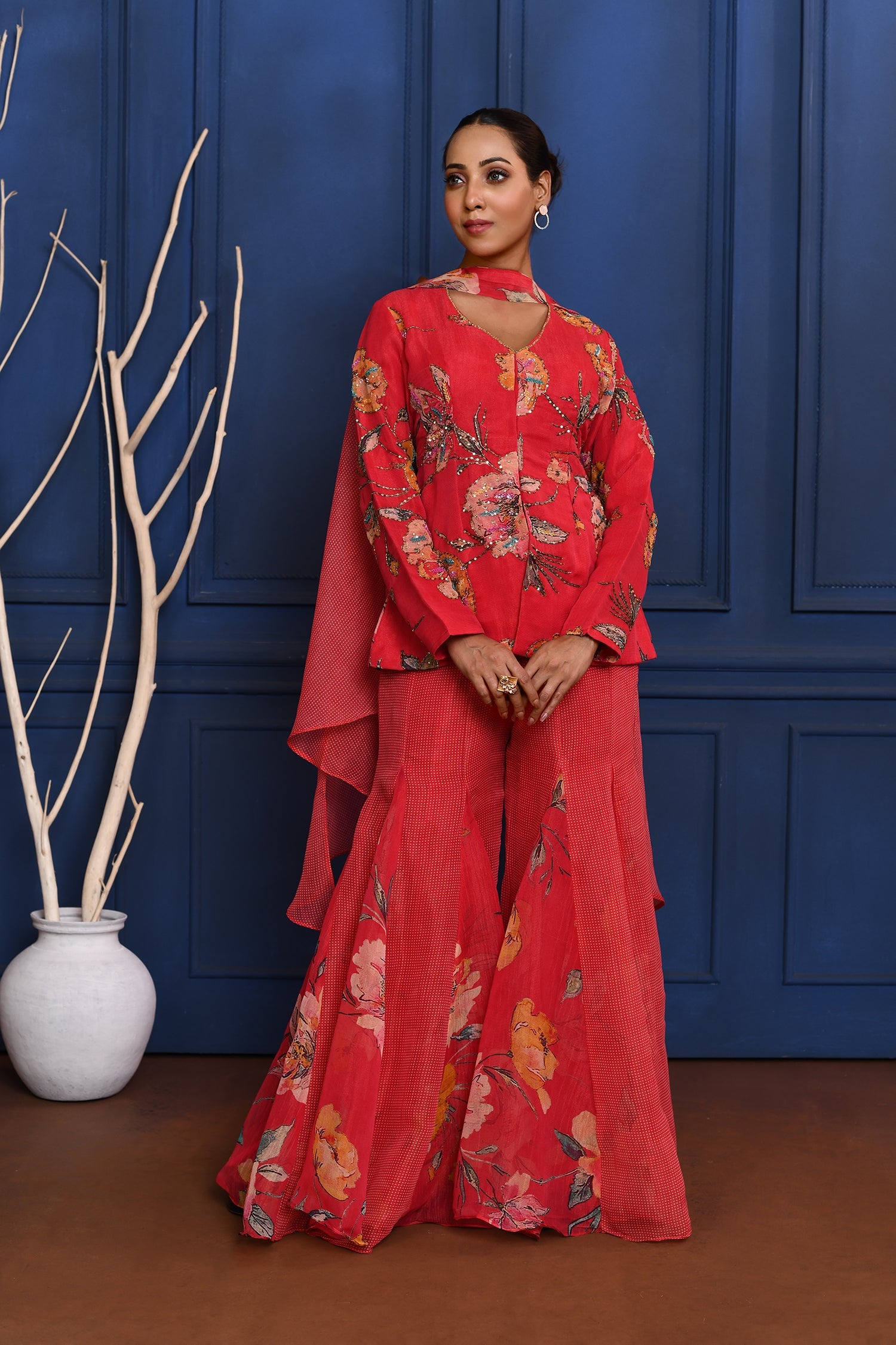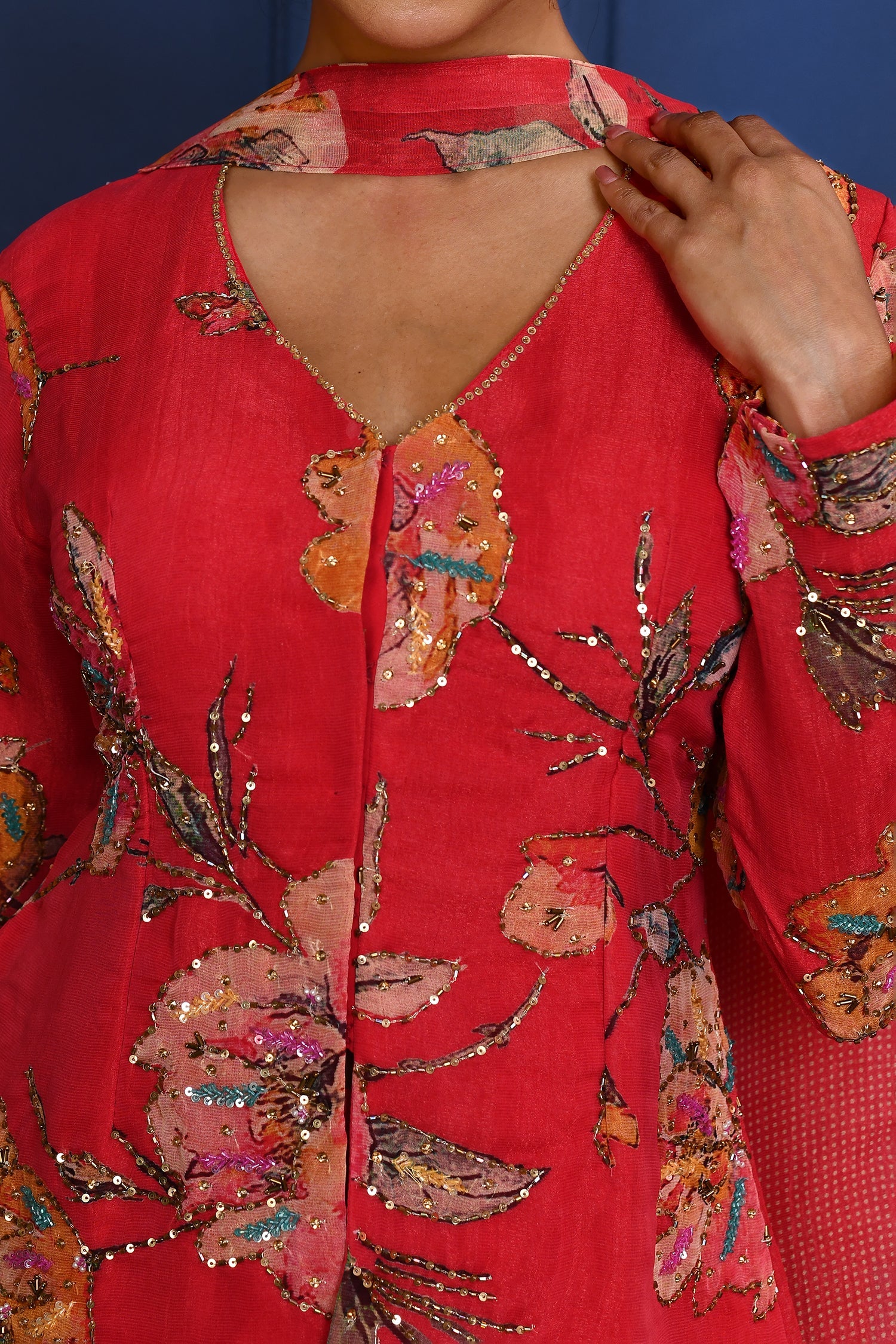 The deep magenta pink floral tissue peplum set with cutdana and sequin embroidery along with georgette dupatta and bottom for a stylish ethnic look .