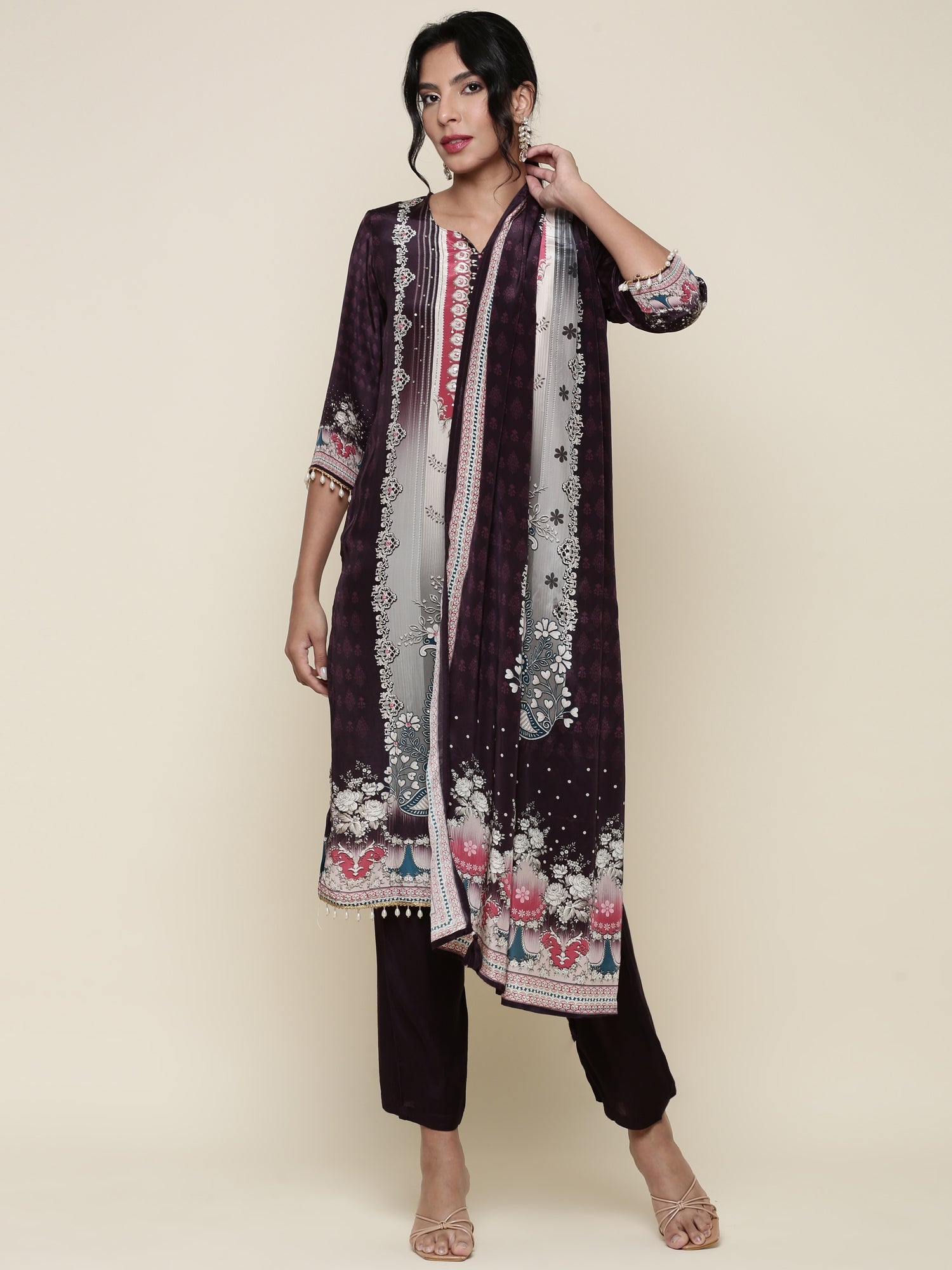 The Deep Wine Digital Printed Three-Piece Suit Set combines sophisticated design with intricate digital printing on rich deep wine fabric. This expertly crafted set includes a kurta, matching bottoms, and a coordinating dupatta, each piece tailored for a flattering fit and all-day comfort. Ideal for festive and formal occasions, the digital print adds depth and visual interest, enhancing the timeless appeal of traditional attire with a contemporary edge. Perfect for those seeking elegance and style in one complete ensemble.